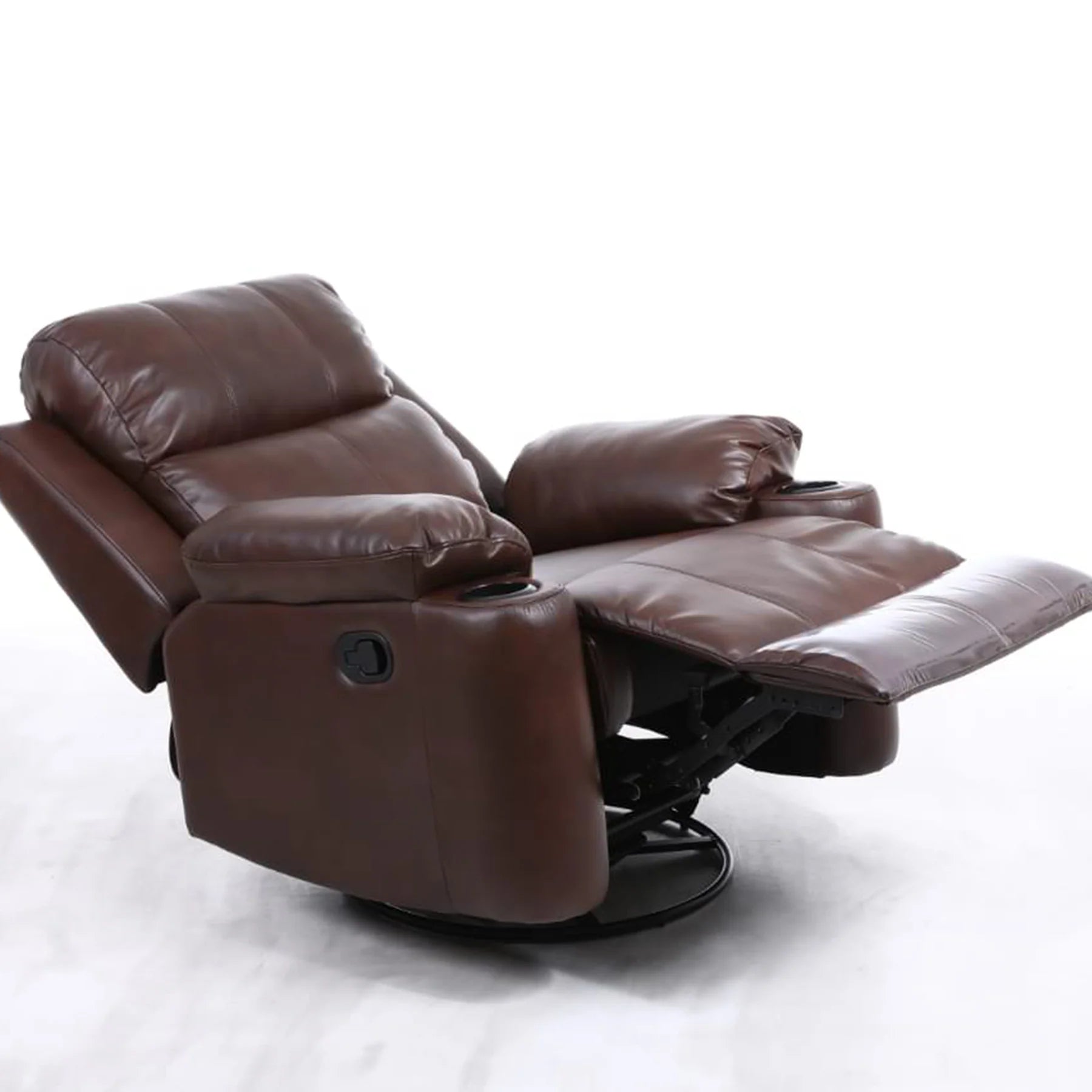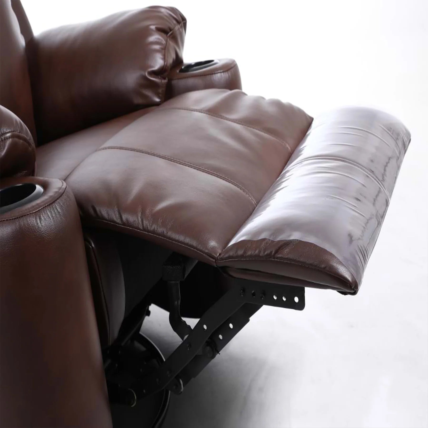 This deep brown recliner combines premium leather with built-in cupholders and storage. Its classic cushioned design and wide arms provide ultimate relaxation. Ideal for home theaters or luxurious lounges.