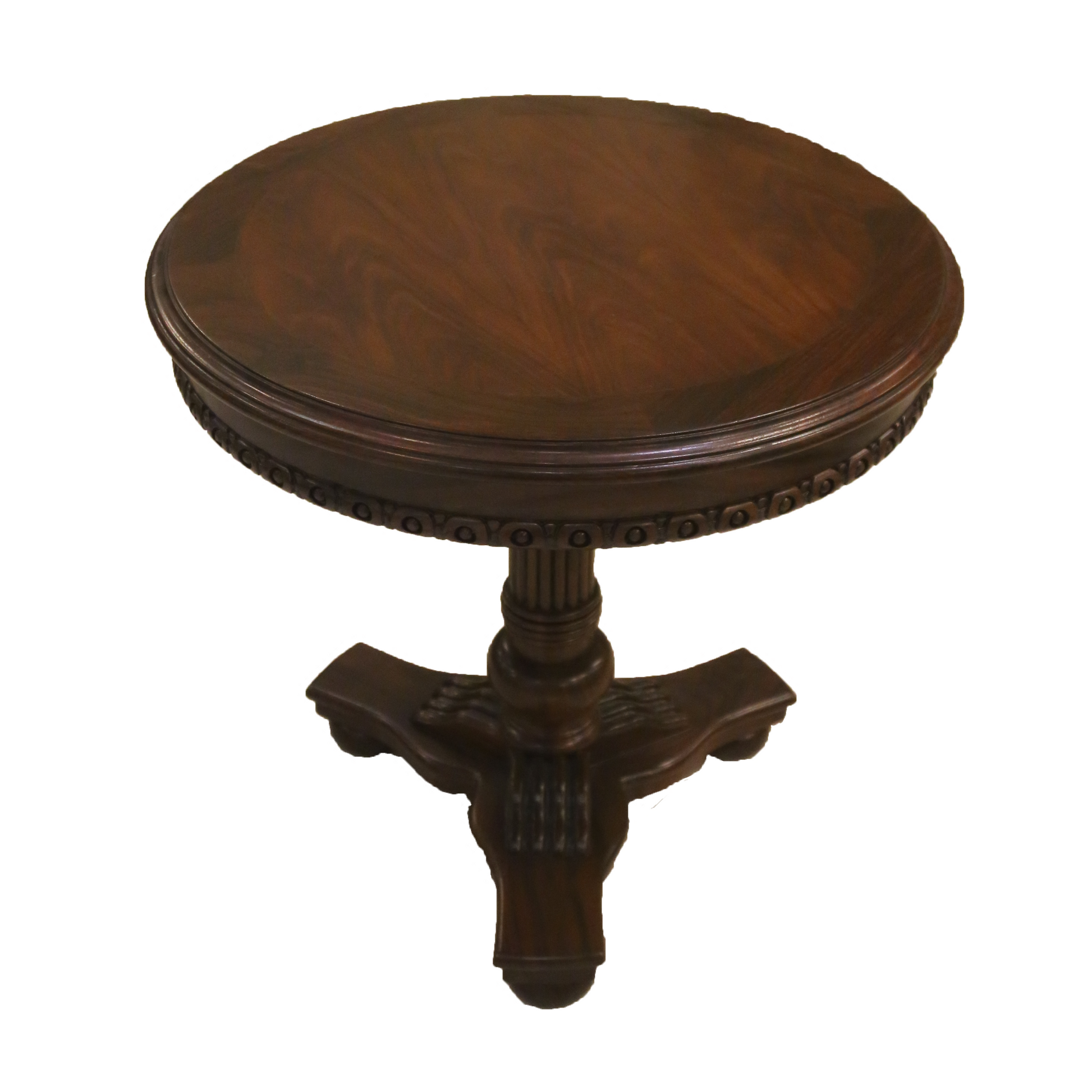 Circular top supported by a single central column and three carved claw-foot legs, showing strong Victorian influence.