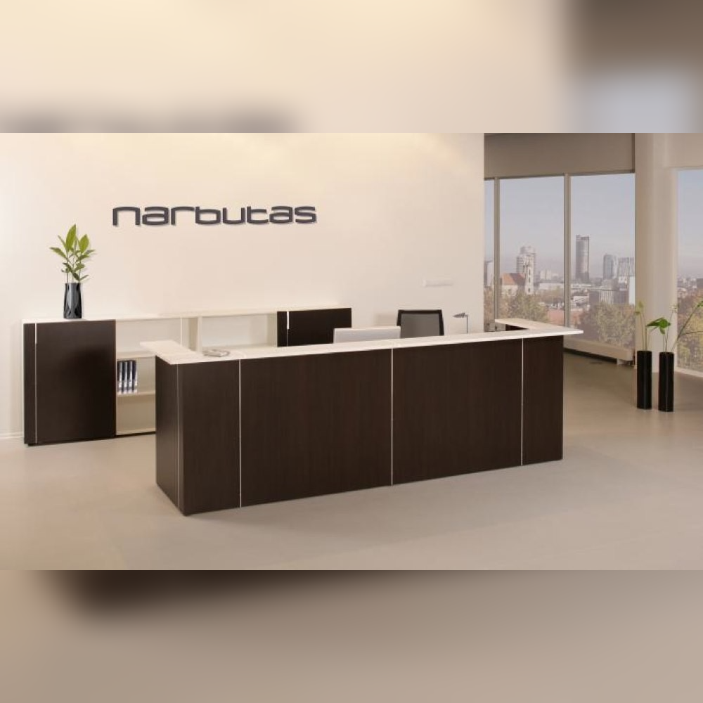 The contrast lends sophistication while the structure offers ample storage. Well-suited to law firms or upscale corporate offices.