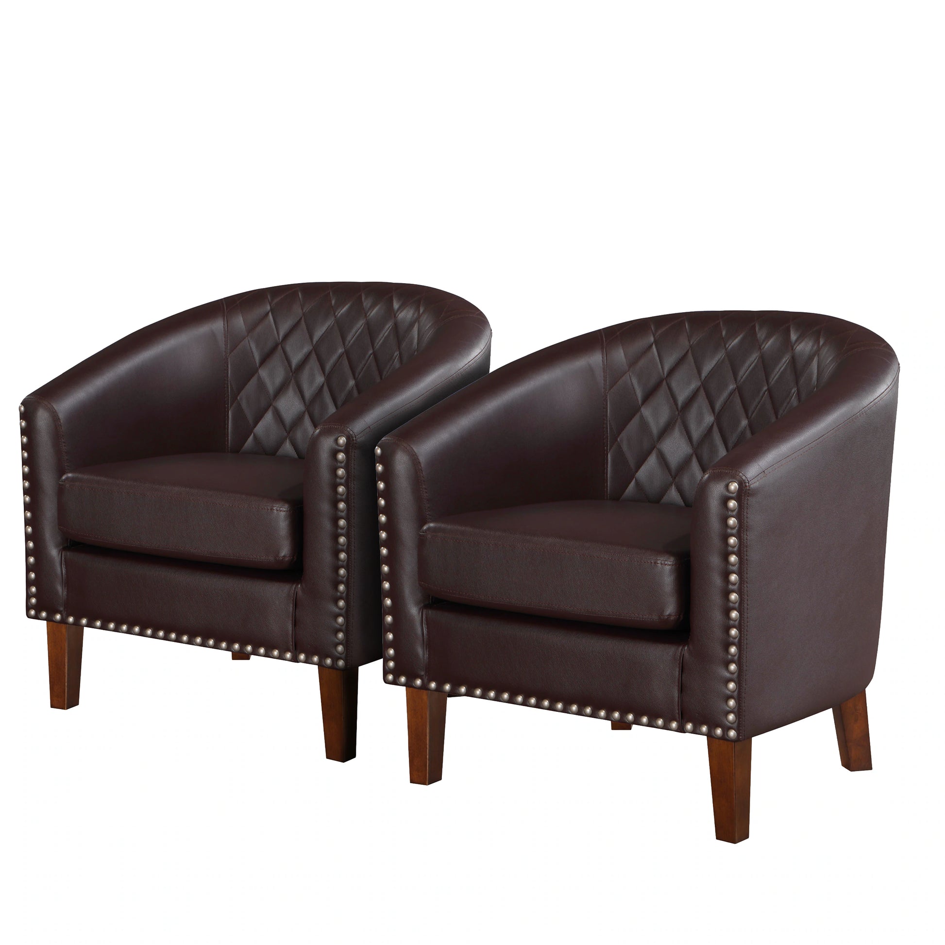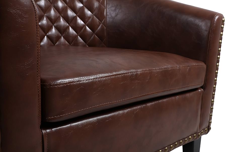 A compact leather chair with deep diamond tufting and nailhead trim. Its rich brown finish exudes warmth and sophistication. Excellent for home offices or hotel lobbies.