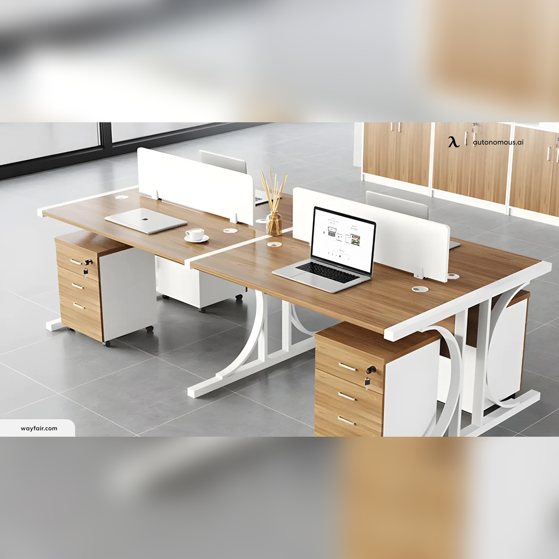 A practical and ergonomic design using a medium wood finish and clean white T-shaped metal legs. Paired with rolling pedestal drawers and modesty panels, it supports individual focus and team flow. Ideal for startup offices or shared desks.