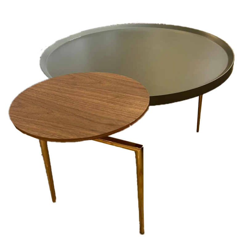 Striking a balance between softness and structure, this table combines a large round tinted glass top with a smaller wood circle intersecting part of the surface. Supported by a minimal gold frame, it’s a sleek and artistic option for contemporary homes.