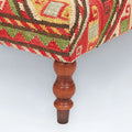 Upholstered in a bold, patterned fabric with tribal motifs and supported by turned wooden legs, this ottoman adds a vibrant cultural touch to any room.