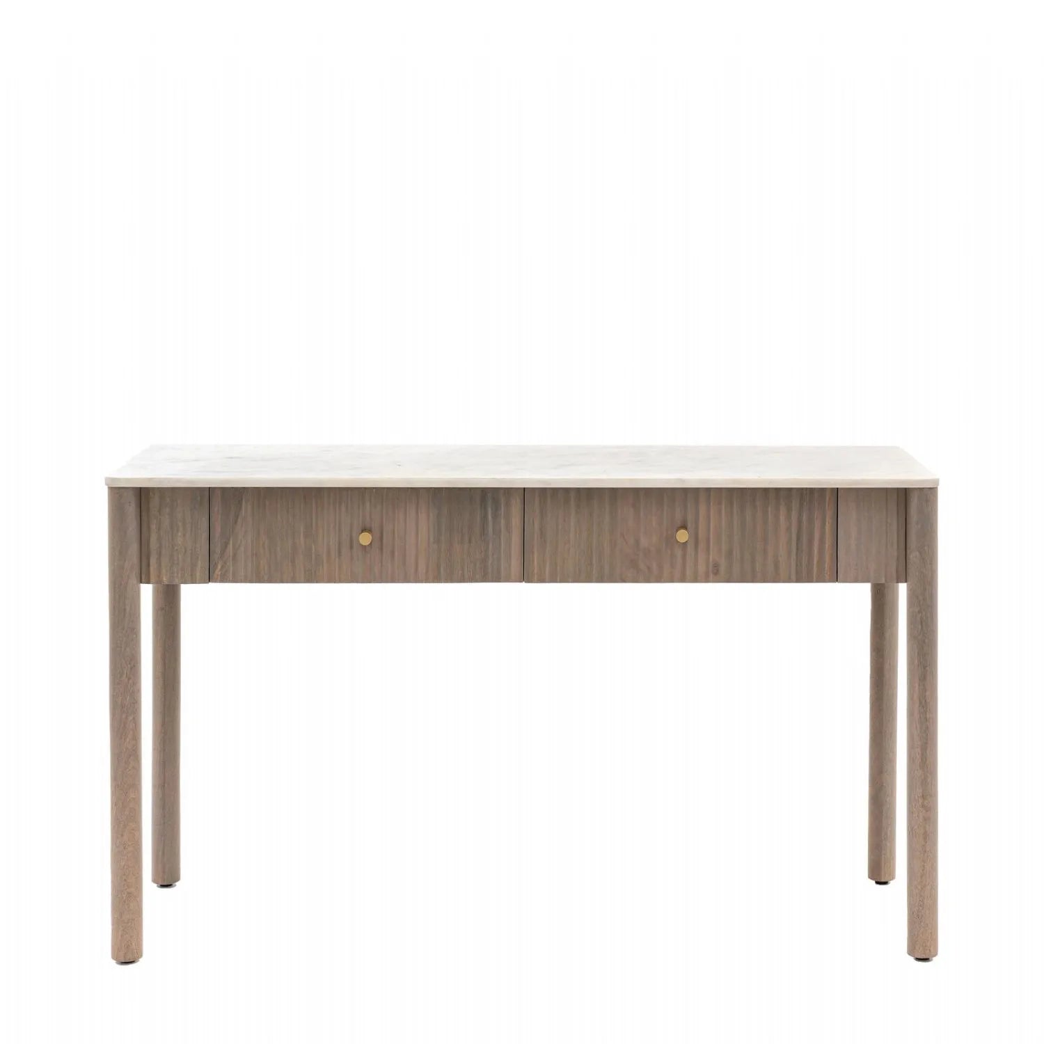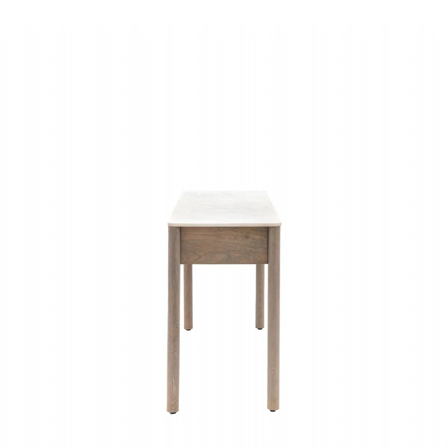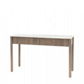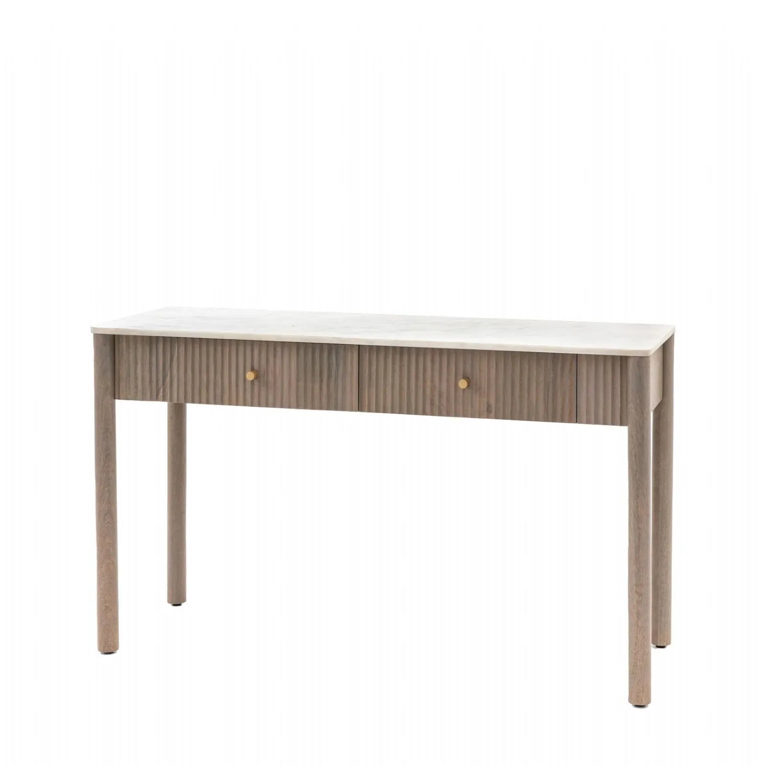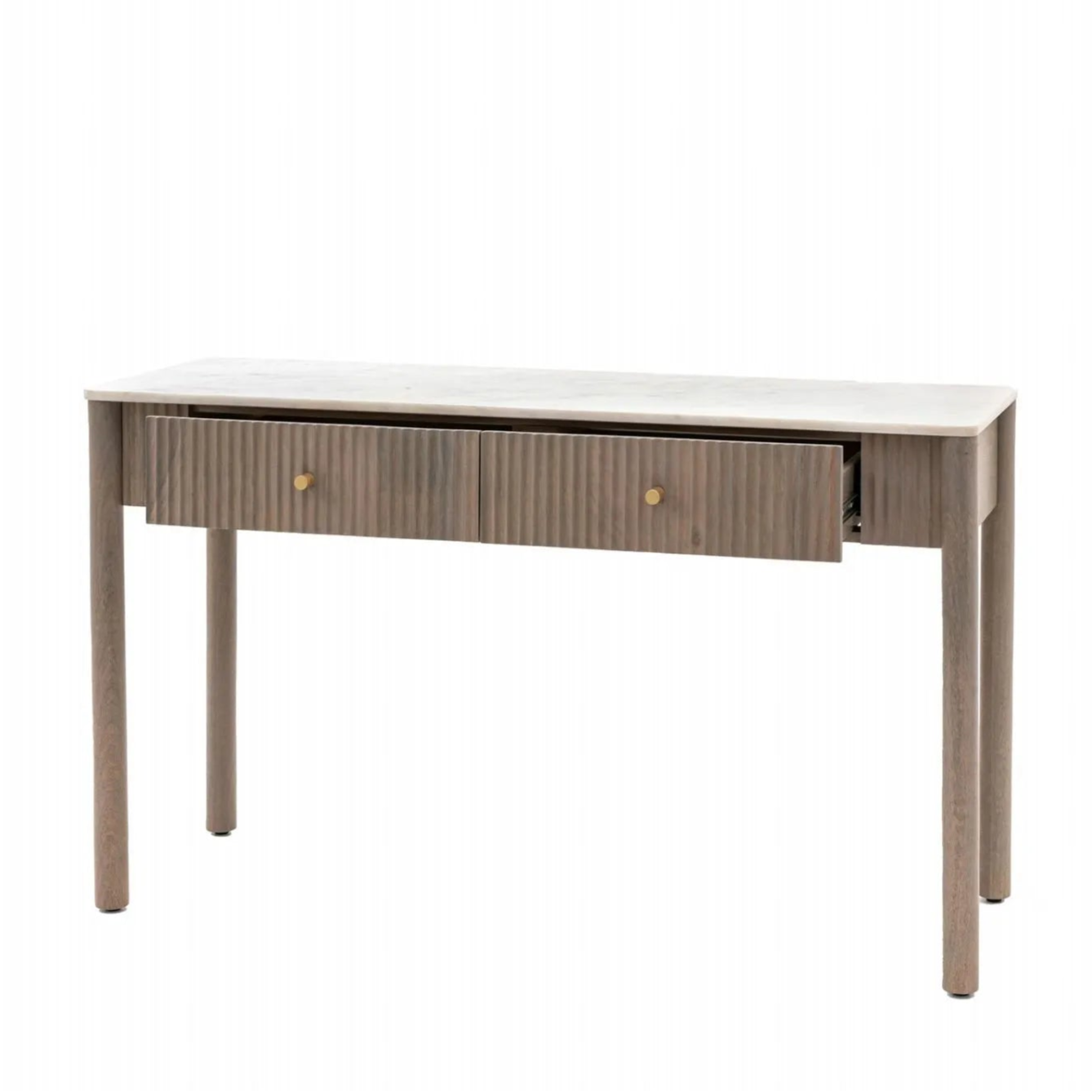 Understated yet refined, this console table is a celebration of subtle texture and minimalist design. Its fluted front drawer panels add an element of sophistication while maintaining a neutral color palette. The slender tapered legs contribute to a clean silhouette that complements traditional, transitional, or modern decor.