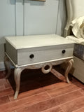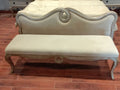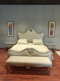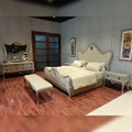 A sophisticated bedroom setup with tufted bedframe and coordinating side tables. Light pastel tones and gentle curves create a serene ambiance. Perfect for elegant and luxurious interiors.