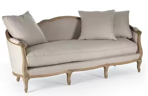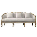 This sofa exudes refined European elegance with its sculpted wooden frame and curved silhouette. The light beige upholstery complements the distressed natural wood, creating a soft, romantic aesthetic. Gently flared arms and cushioned seating provide comfort without compromising on style. The triple-sectioned seat and plush pillows complete its luxurious charm.