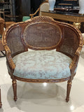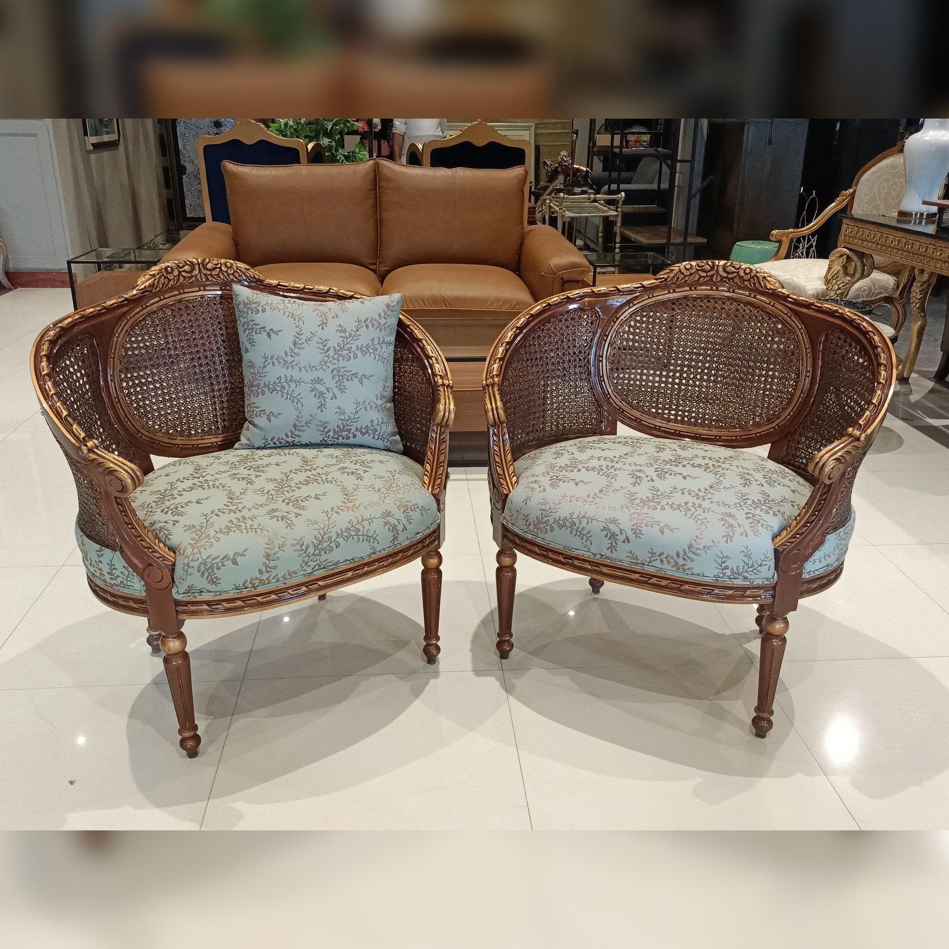 Elegantly upholstered chairs with floral brocade fabric and carved wooden frames. Their rounded backs and padded arms ensure both style and comfort. A charming addition to drawing rooms or reading corners.