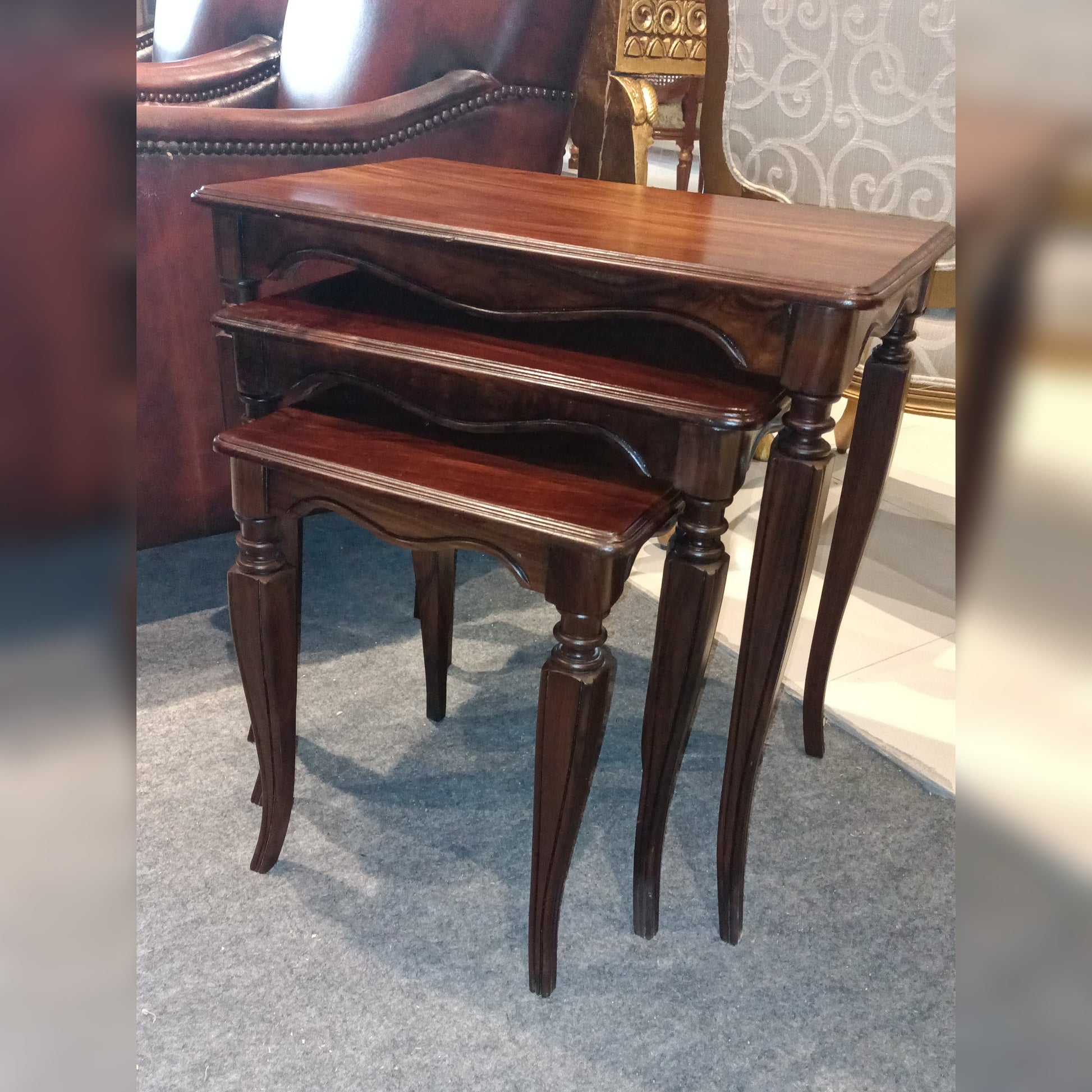 This side table boasts French-style curves and ornate legs in a polished wooden finish. A beautifully detailed table ideal for placing beside classic chairs or beds. Elegant and functional for displaying décor items.