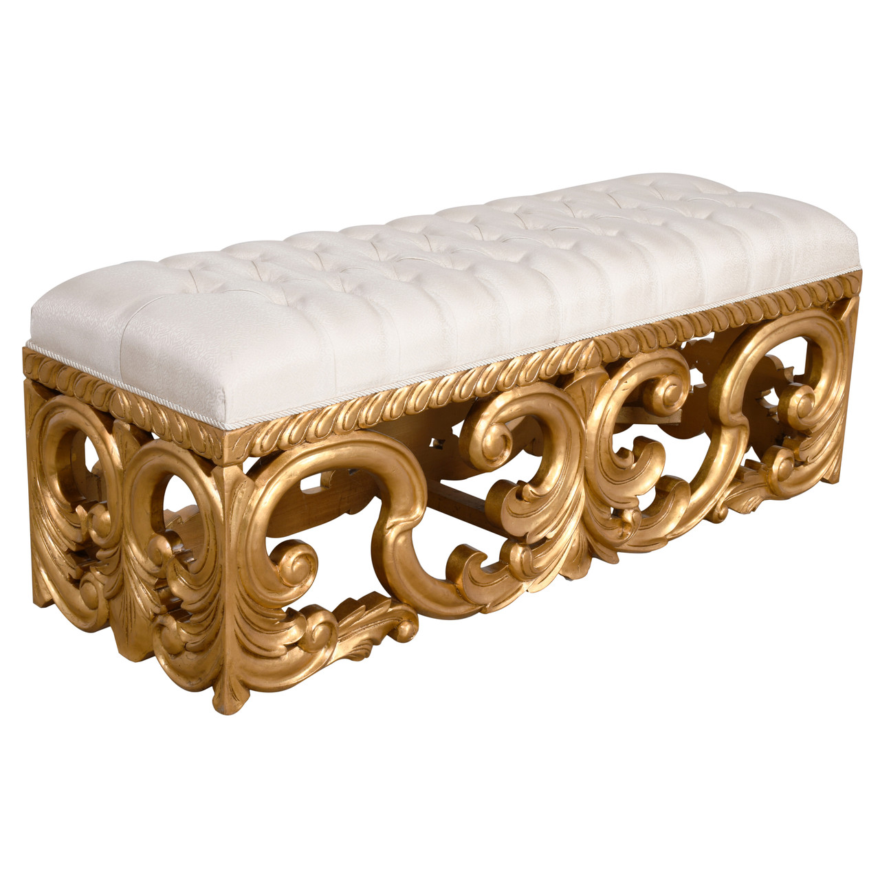 Featuring opulent gold-painted carved wooden panels and a tufted white cushion, this ottoman blends classic baroque design with luxury seating functionality.