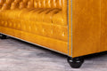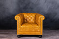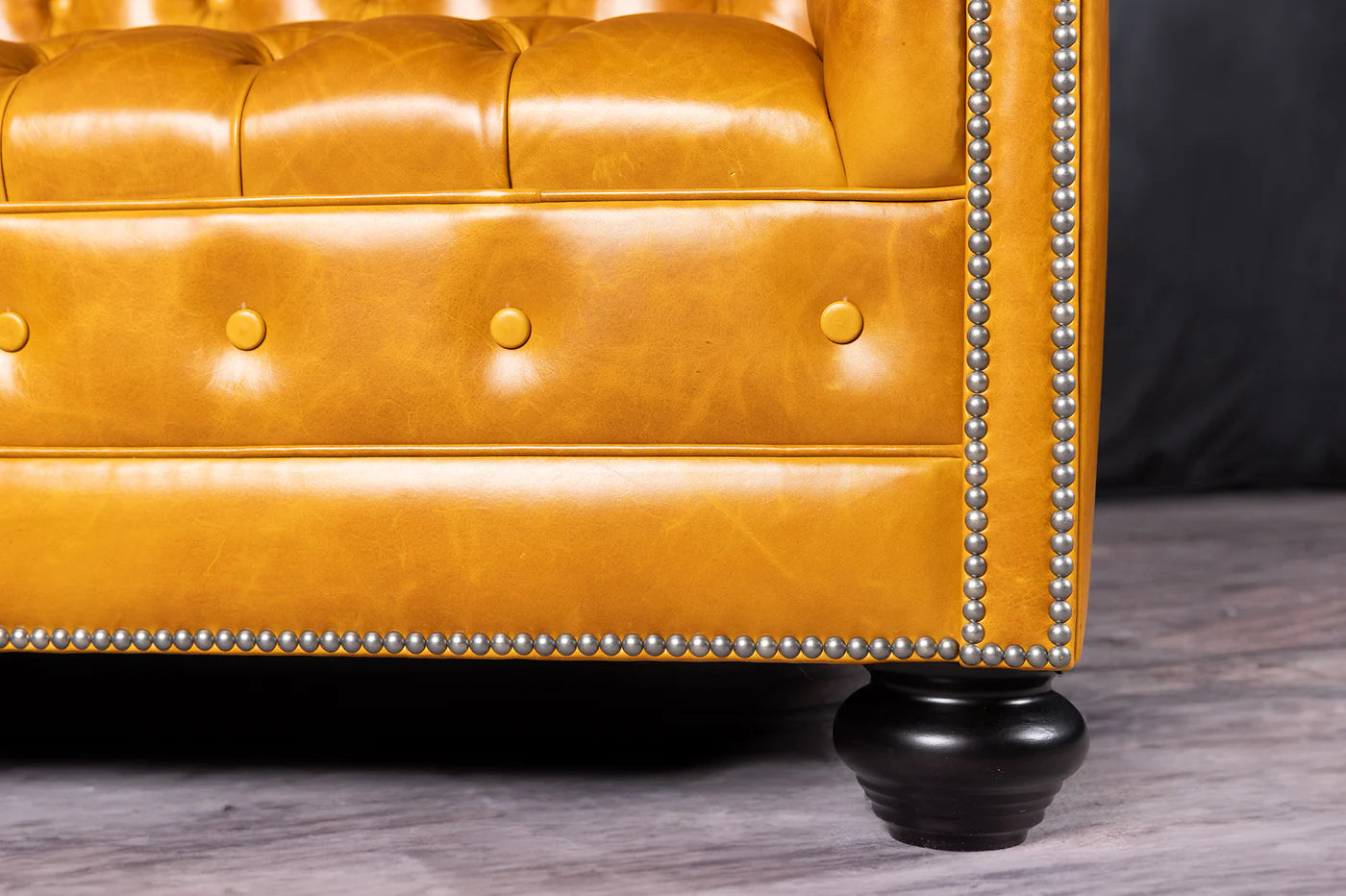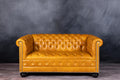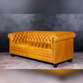 This bright mustard-toned leather sofa features traditional Chesterfield styling. The vibrant color adds warmth and a unique focal point. Perfect for bold and artistic interior themes.