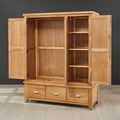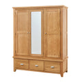 A practical wooden wardrobe with a central mirror flanked by two solid doors. Below, three pull-out drawers offer ample storage, with the natural wood grain enhancing its warmth. Great for bedrooms where both function and natural aesthetics matter.