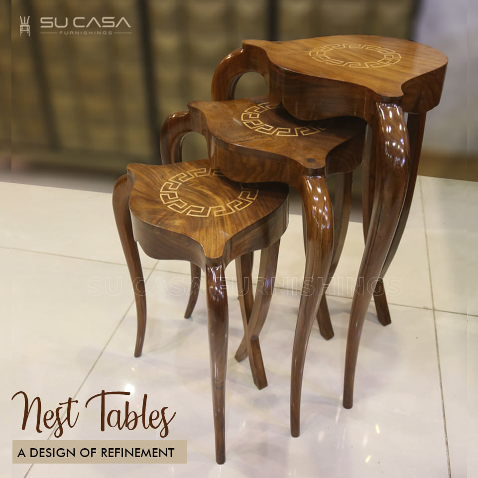 Showcasing intricate hand-carved floral patterns, this set is made from rich teak or sheesham wood. The uniquely curved legs and ornate carvings exude craftsmanship and elegance. Ideal as a decorative and functional art piece in classic interiors.
