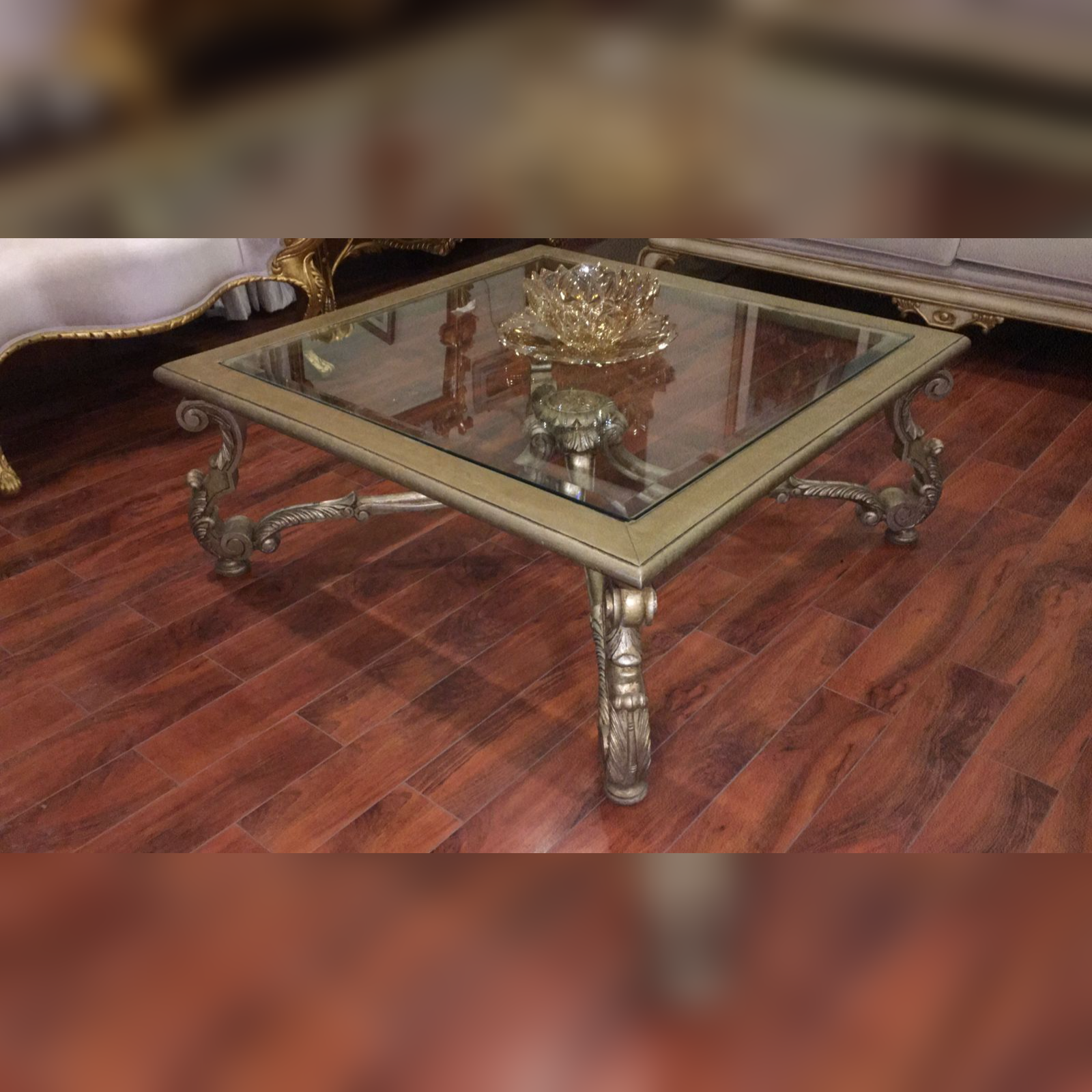 Glass top square table with elaborately carved wooden base in a metallic bronze finish, resting on claw-style legs.