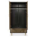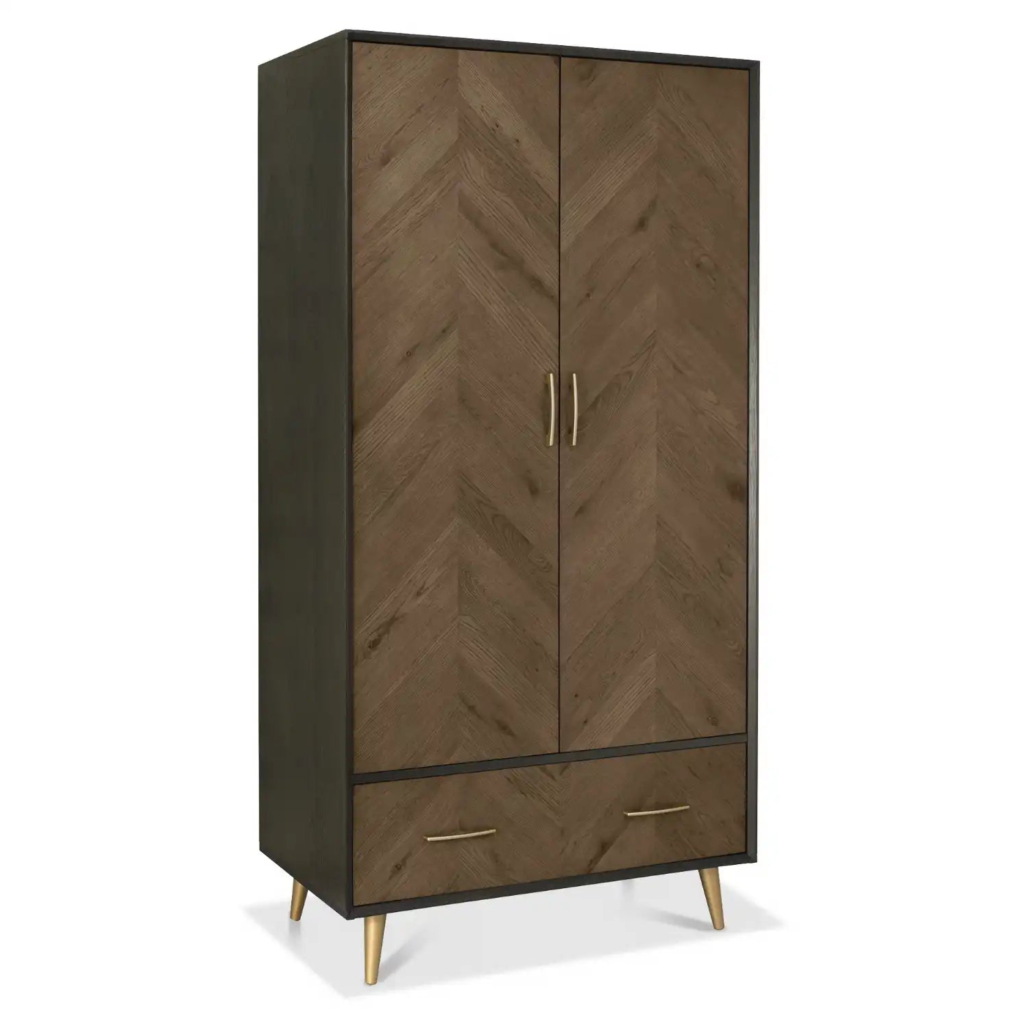 This sleek wardrobe-style cabinet boasts a bold herringbone pattern on its wooden doors. Finished in a rich walnut hue with minimal brass handles and angled legs, it exudes modern luxury. A bottom drawer adds extra storage functionality.