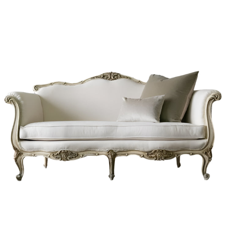 This sofa showcases a delicately carved wooden frame in a weathered finish, with plush ivory cushions and a subtly curved backrest. Traditional legs and antique scroll detailing make it a refined yet soft piece. Its muted tones allow it to blend seamlessly into shabby chic or French provincial decor.