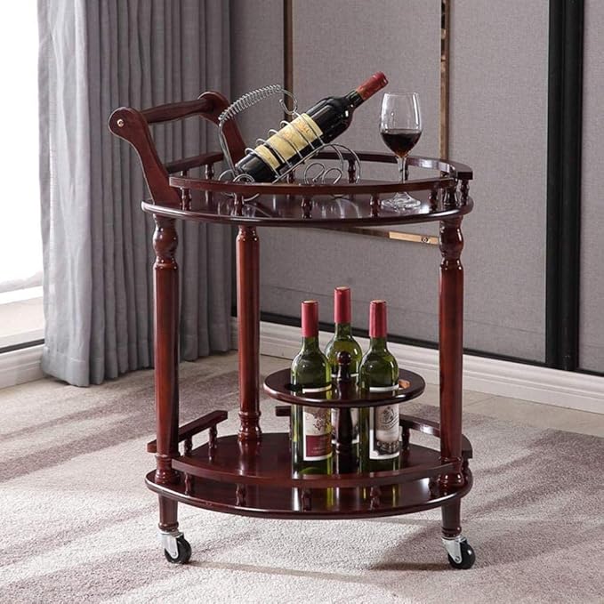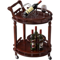 Crafted from rich mahogany-toned wood, this elegant tea trolley features two oval tiers with protective rails, curved handles, and turned wood legs. The upper tray includes integrated wine holders and a smooth glossy finish. Swiveling casters allow graceful mobility, complementing its traditional design.