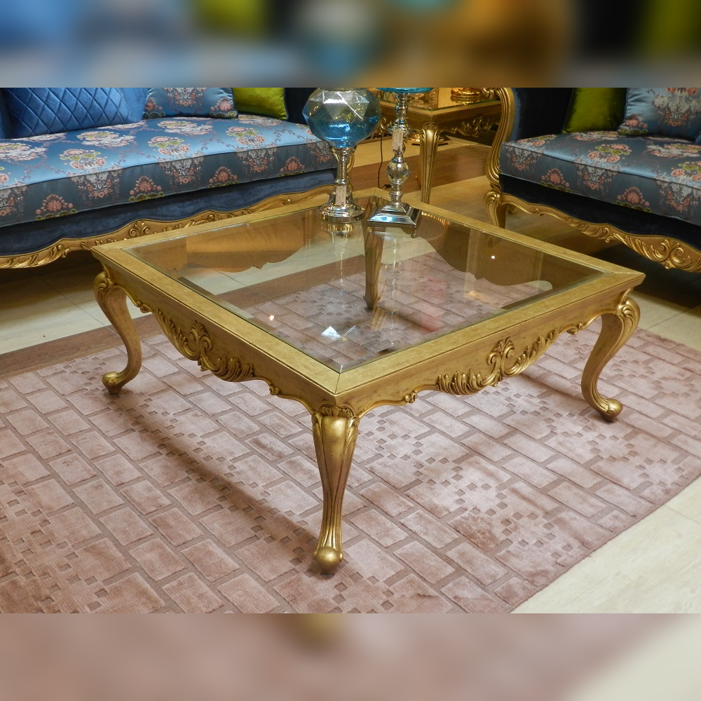 Decorative square glass-top table with lavish gold leaf finish, carved floral motifs, and French-style curved legs with foot detailing.