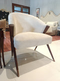 These fabric armchairs feature a subtle rounded back with tapered wooden legs. Their understated elegance fits well in vintage-inspired or modern minimalist settings. Upholstered in neutral tones for versatile placement.