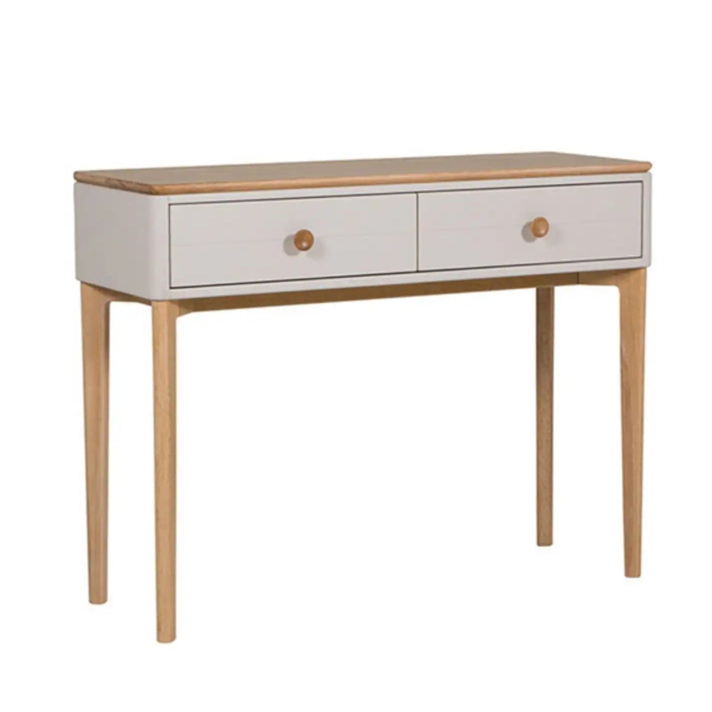 Blending mid-century aesthetics with modern simplicity, this console offers clean lines and dual-tone wood finishing. The body features a warm wood frame paired with soft gray drawer fronts and circular wooden knobs. Tapered legs give it a light, elevated presence, ideal for compact spaces needing subtle elegance.