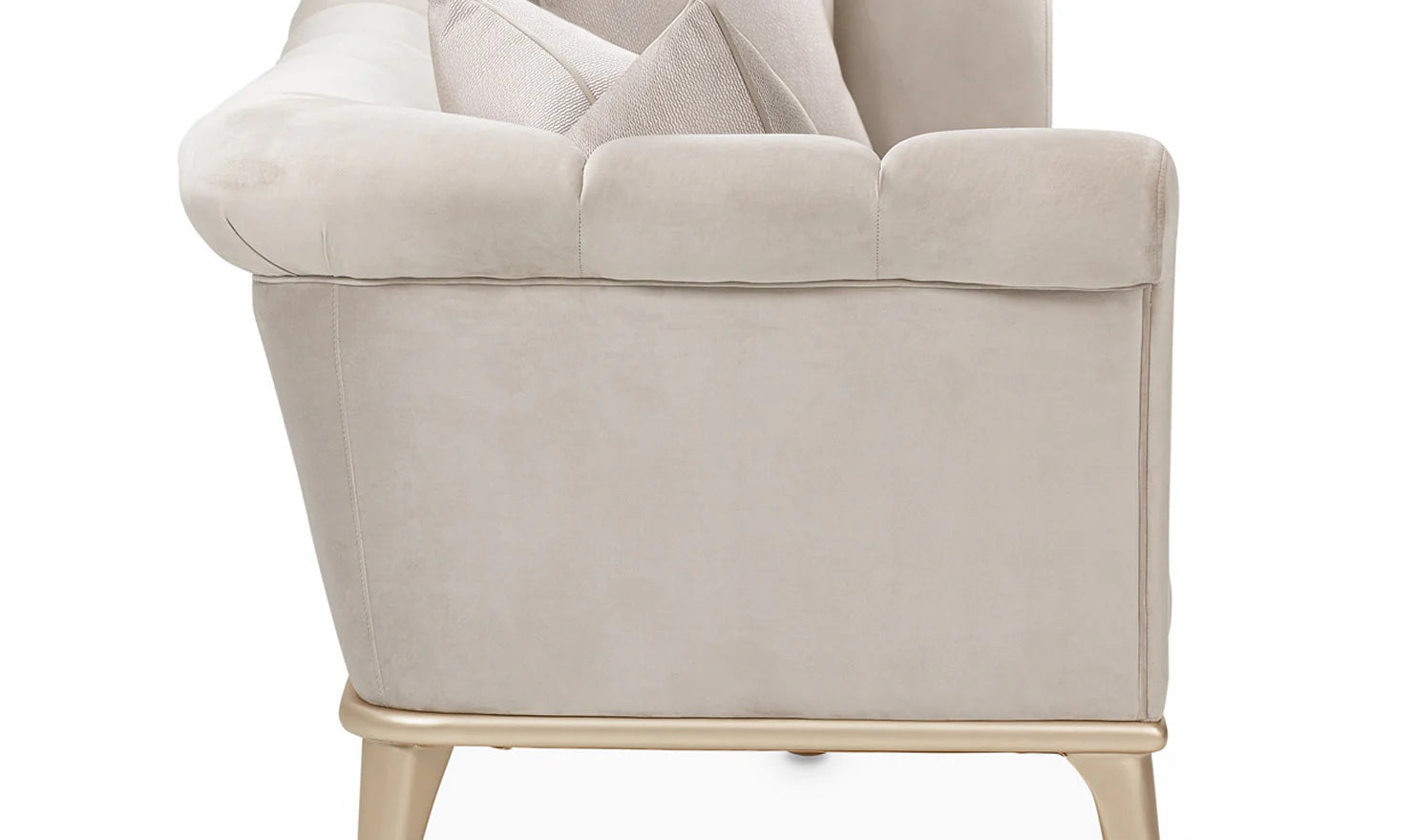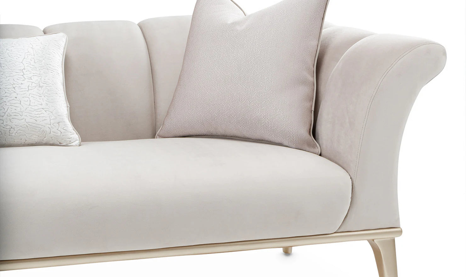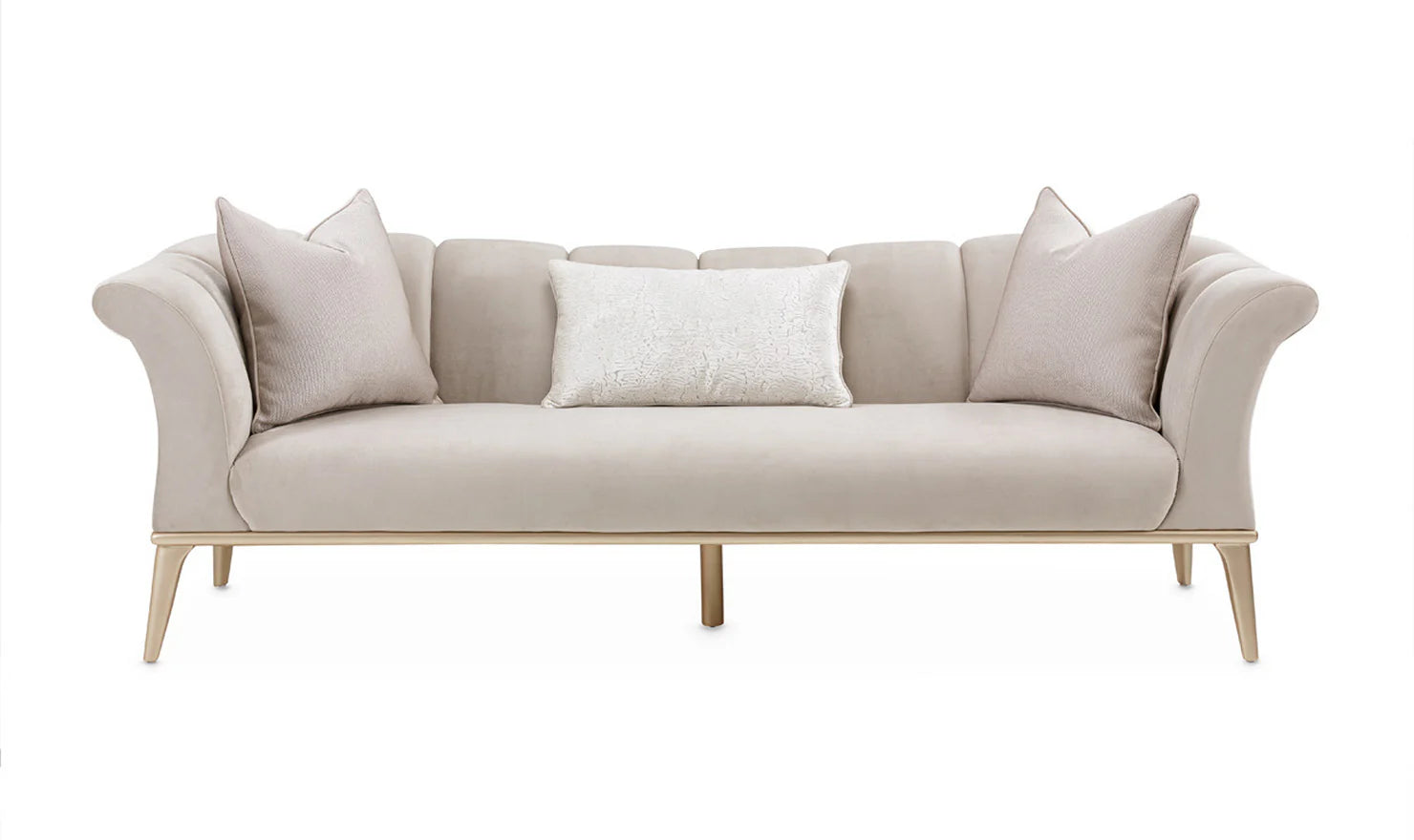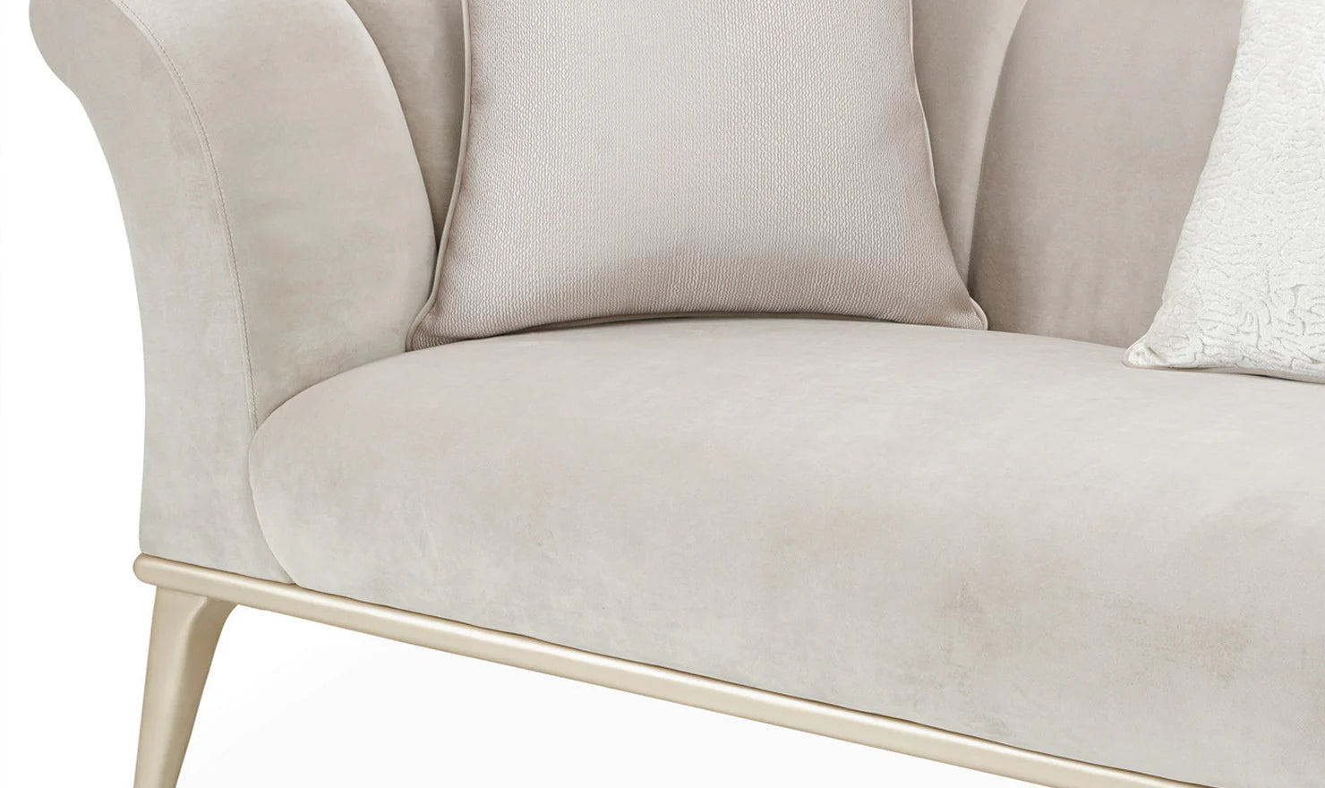 This light beige velvet sofa displays minimalist elegance with its airy design and slender silhouette. The gently flared arms and slim profile are balanced by tapered golden legs that offer a mid-century nod. A low back and fixed seat design create a clean-lined, open look. It’s perfect for modern, light-filled interiors.