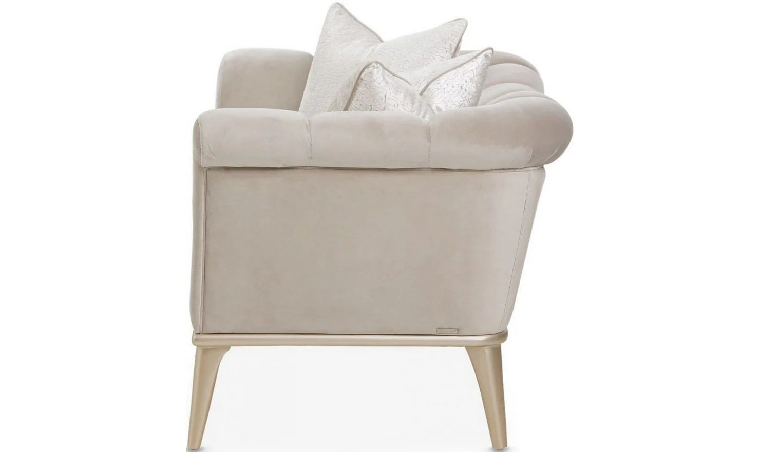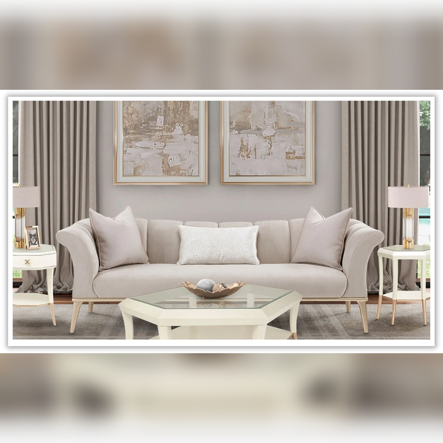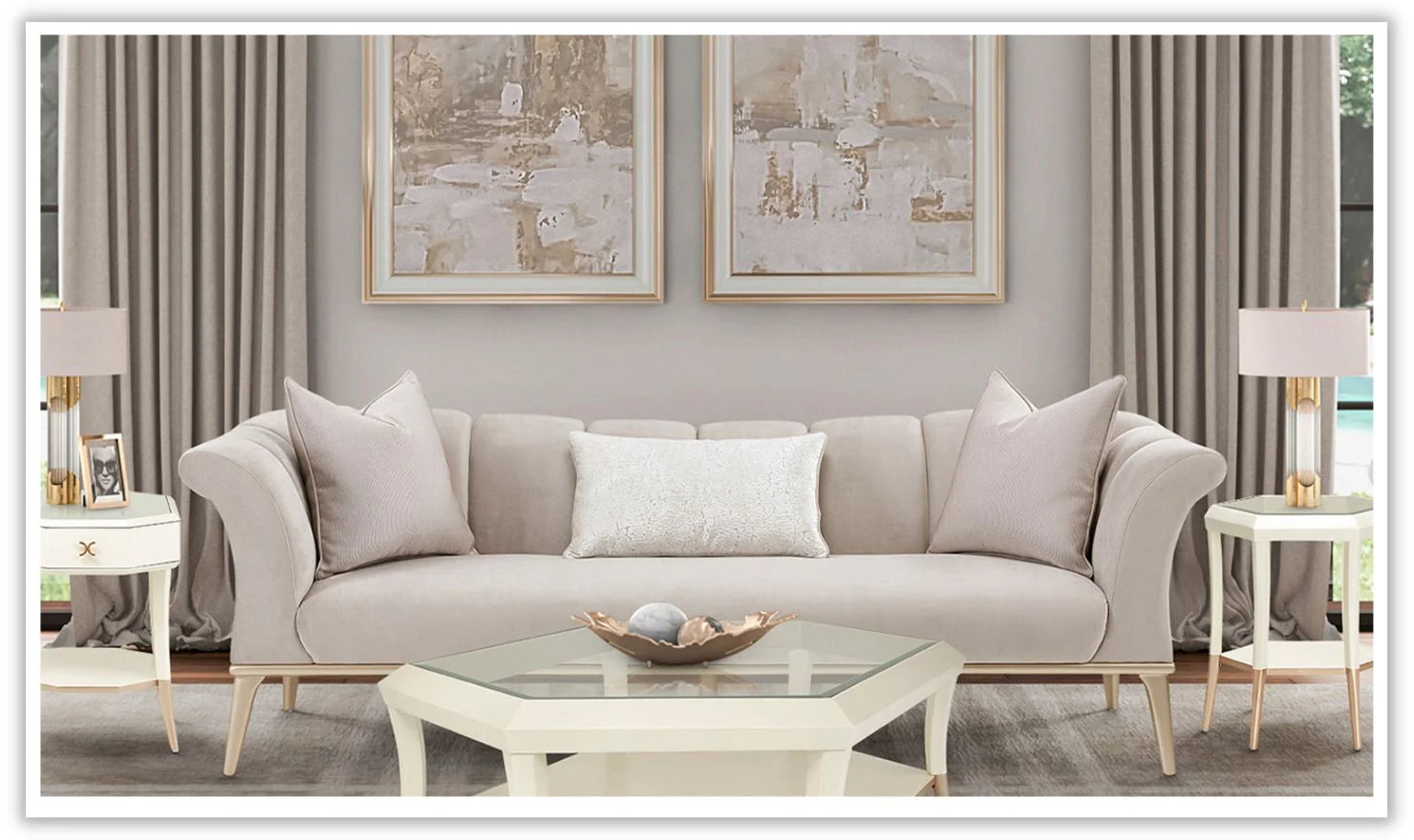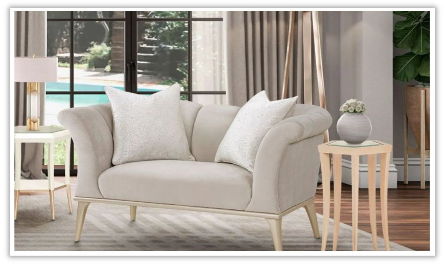 This light beige velvet sofa displays minimalist elegance with its airy design and slender silhouette. The gently flared arms and slim profile are balanced by tapered golden legs that offer a mid-century nod. A low back and fixed seat design create a clean-lined, open look. It’s perfect for modern, light-filled interiors.