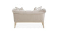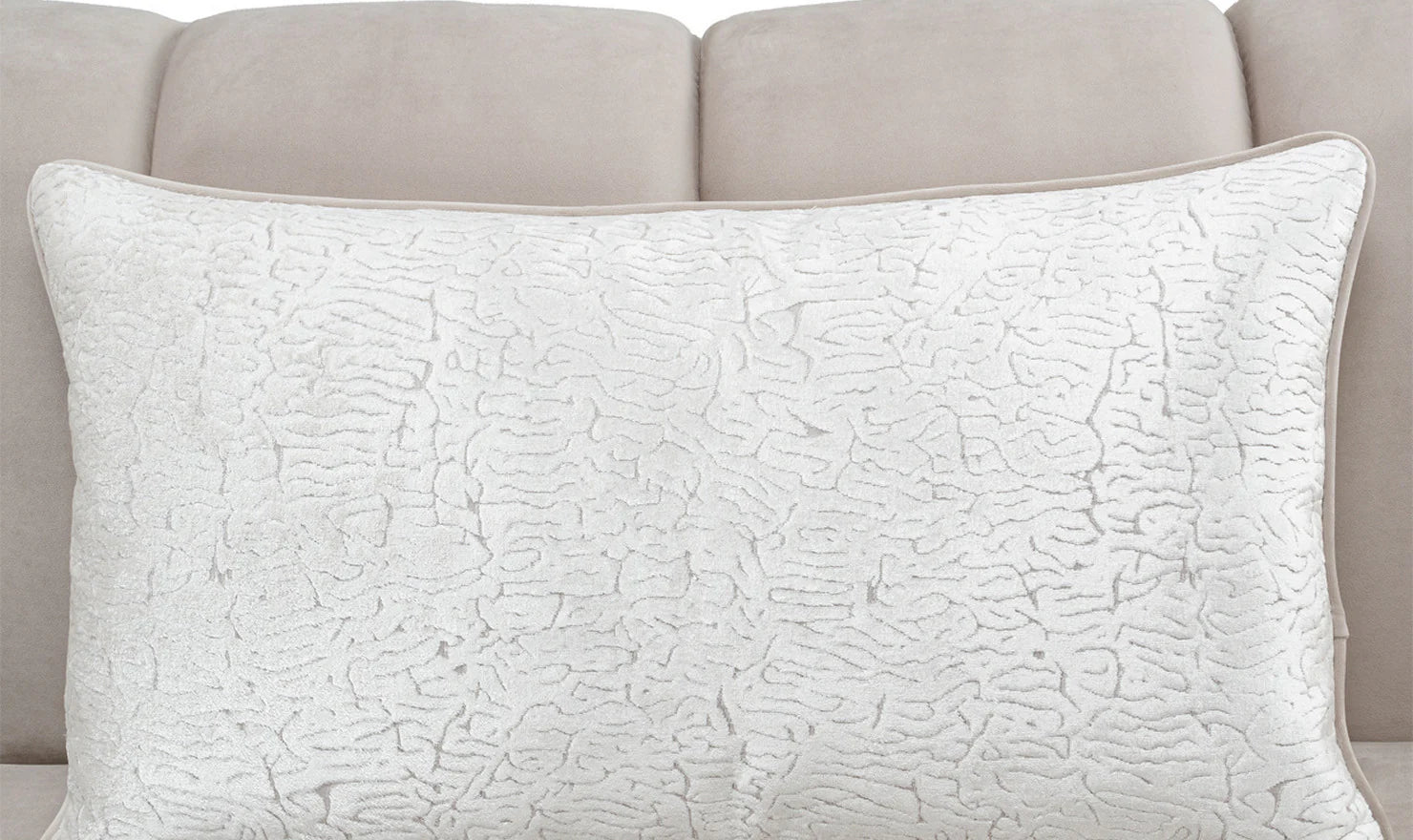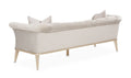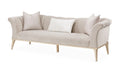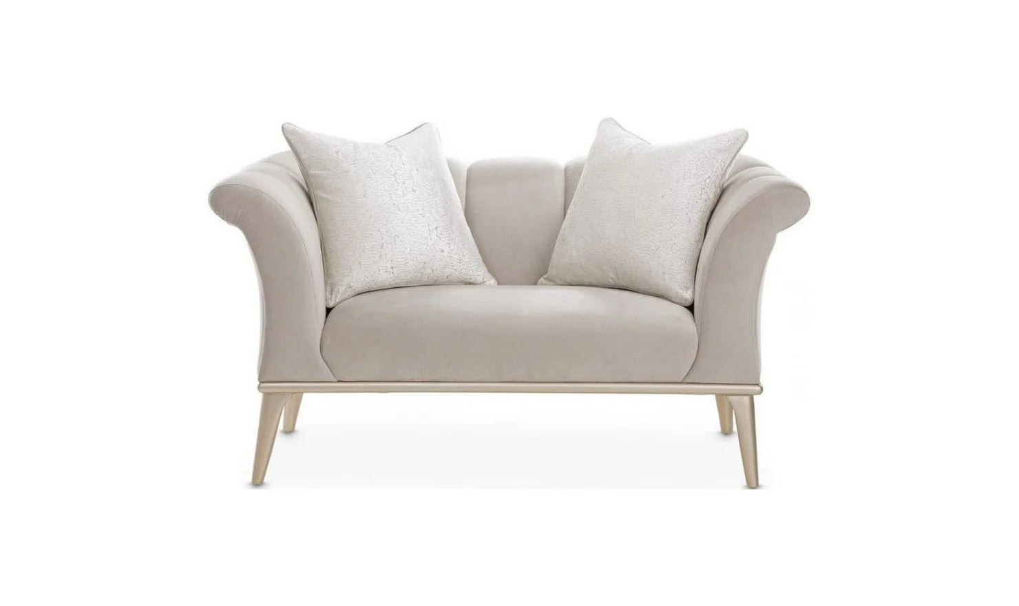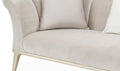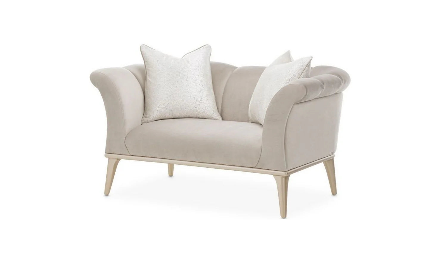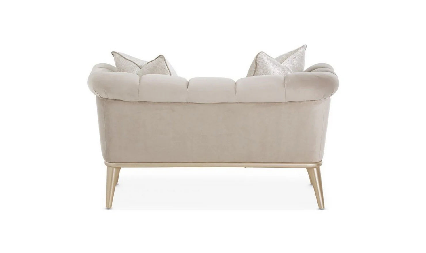 This light beige velvet sofa displays minimalist elegance with its airy design and slender silhouette. The gently flared arms and slim profile are balanced by tapered golden legs that offer a mid-century nod. A low back and fixed seat design create a clean-lined, open look. It’s perfect for modern, light-filled interiors.