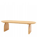 With a natural oak finish and sleek oval top, this table features bold, curved slab legs that provide visual weight and balance. The organic lines and seamless design reflect a Scandinavian influence, ideal for minimalist and modern rustic settings.