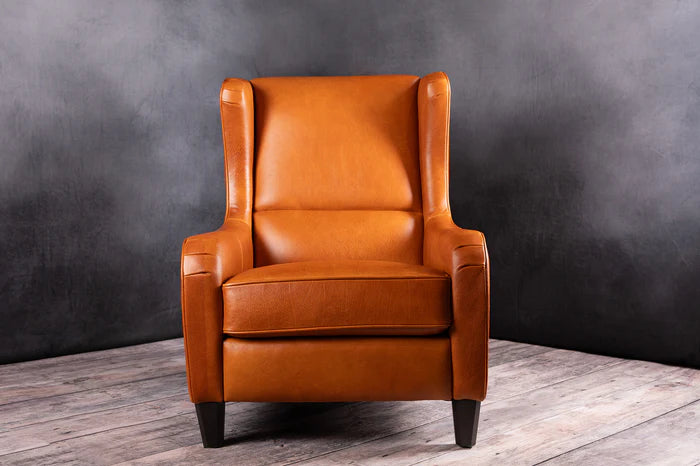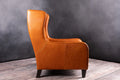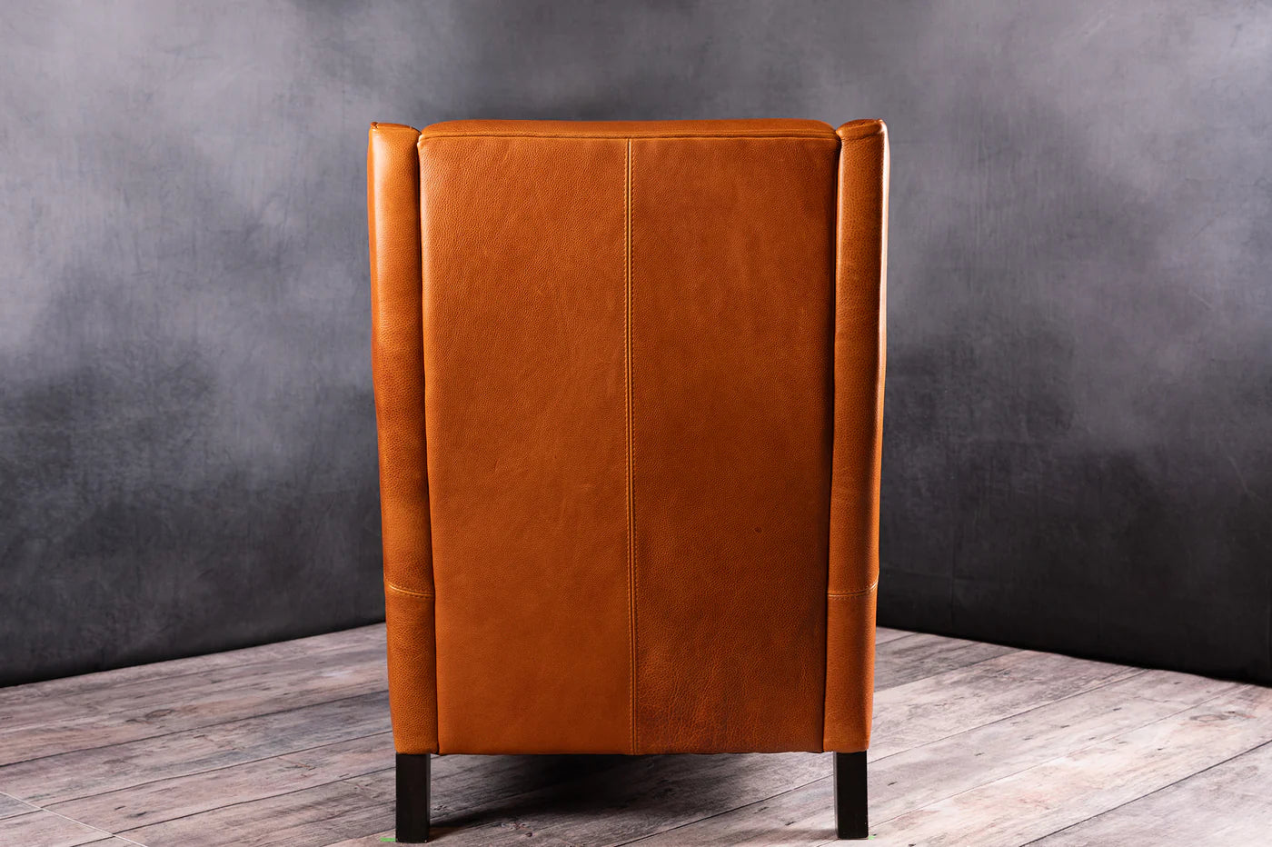 This compact tan leather chair offers structured support and a clean-lined design. Great for small spaces without compromising style. Blends well in industrial and urban environments.