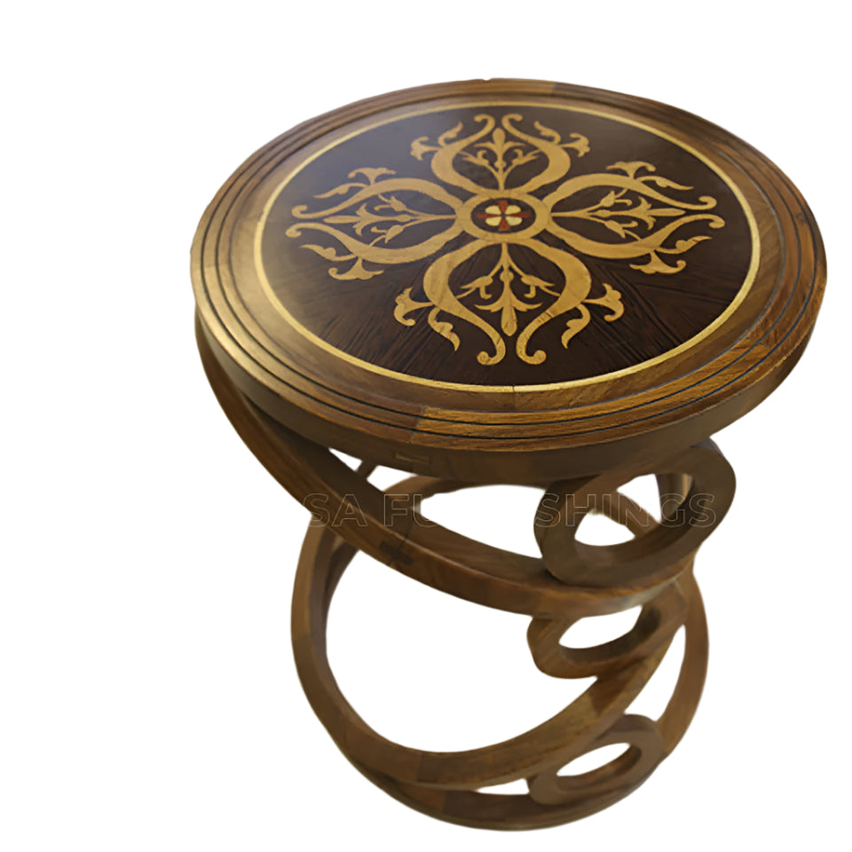 Features a round tabletop with gold inlay pattern and bold spiral legs, merging classical elements with contemporary flair.