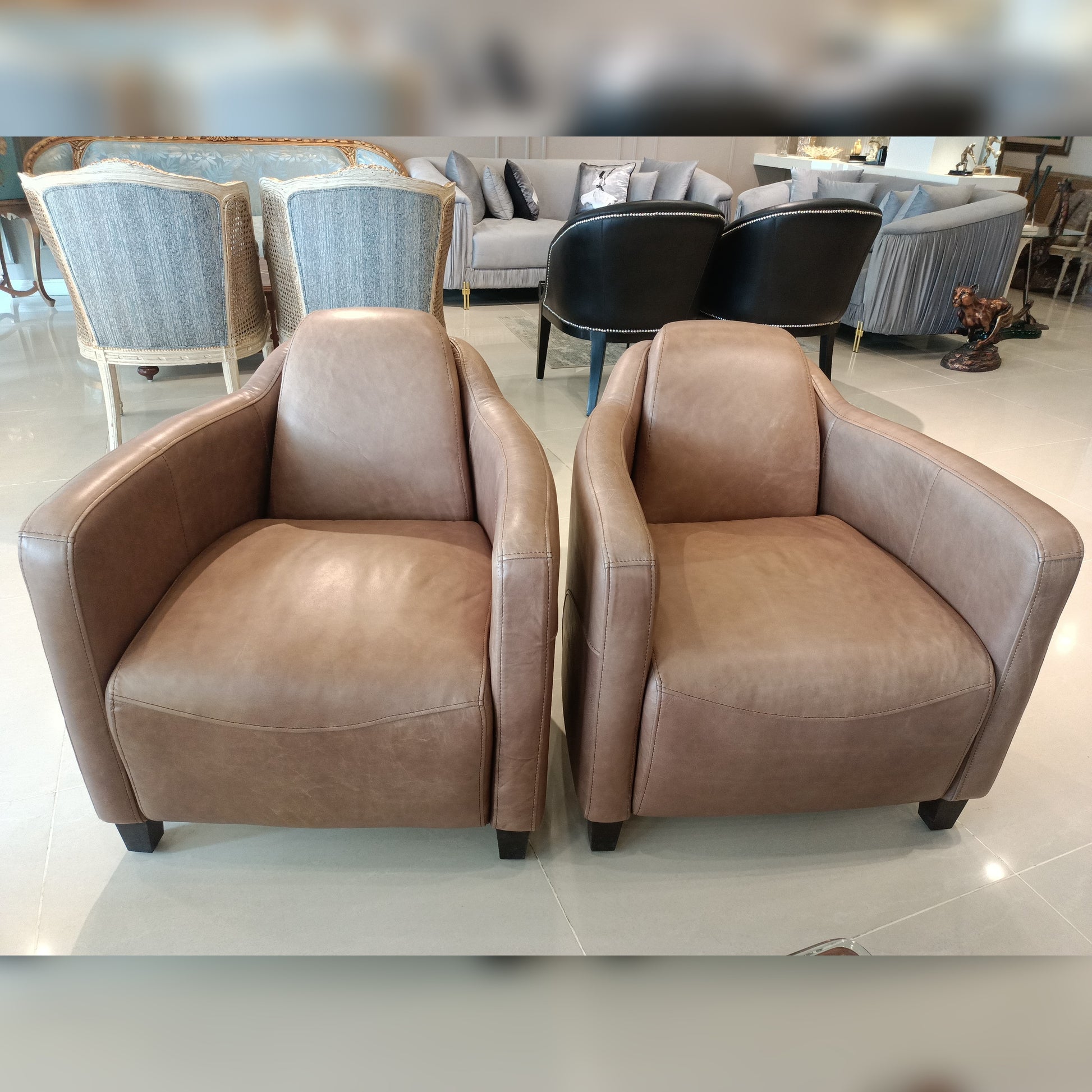 These low-profile armchairs are upholstered in distressed brown leather. Their sleek, angular form makes them ideal for modern or industrial interiors. Comfort meets style in these bold accent pieces.