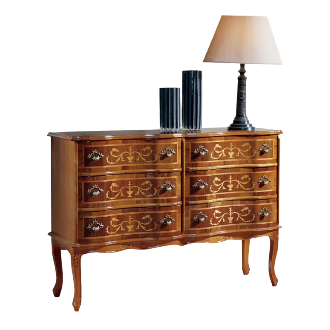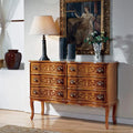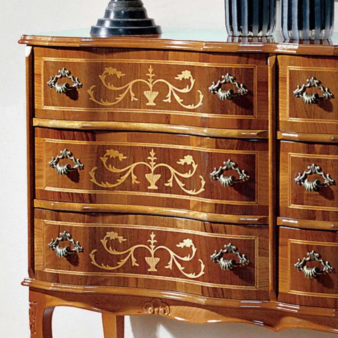This high-gloss wooden chest gleams with luxurious appeal and precise floral carvings. Each drawer showcases polished surfaces contrasted with deep-relief etching. A perfect mix of shine and craftsmanship.
