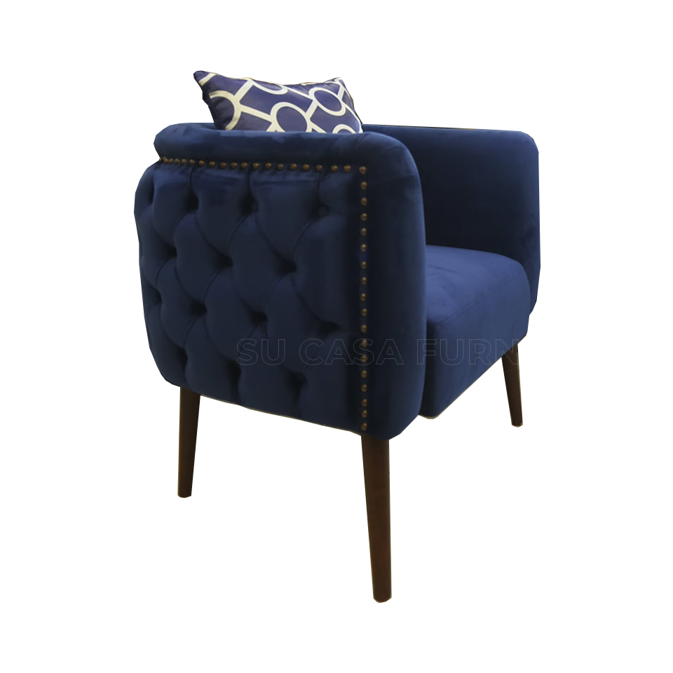 This plush navy blue velvet armchair boasts a deep button-tufted back and rounded edges for a classic yet modern look. Finished with slender wooden legs, it’s perfect for living spaces seeking contrast and charm.