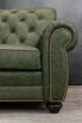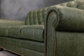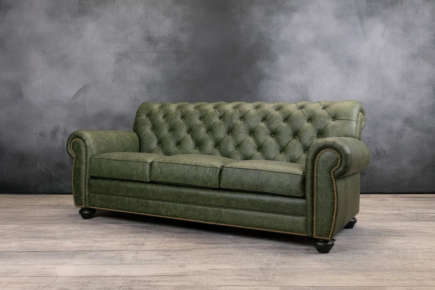 Features deep button tufting and rolled arms in a lush olive green leather. Traditional Chesterfield style meets earthy charm. A perfect centerpiece for classic or vintage-inspired interiors.