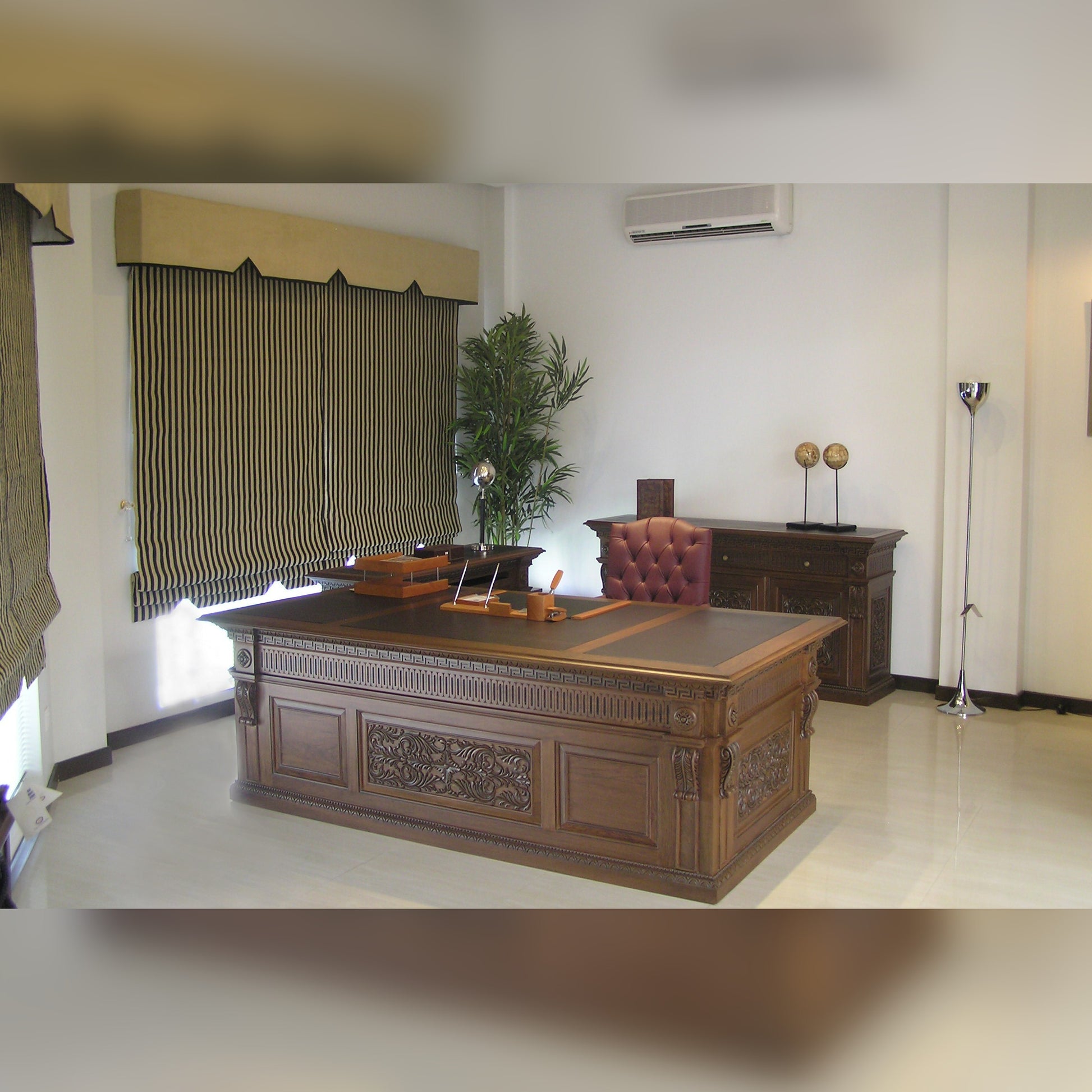Carved floral woodwork adorns the front, paired with a smooth dark tabletop, creating a balance of art and function. Heavy and imposing, it embodies a classic Indian or royal European influence. Great for vintage-themed offices or collectors.