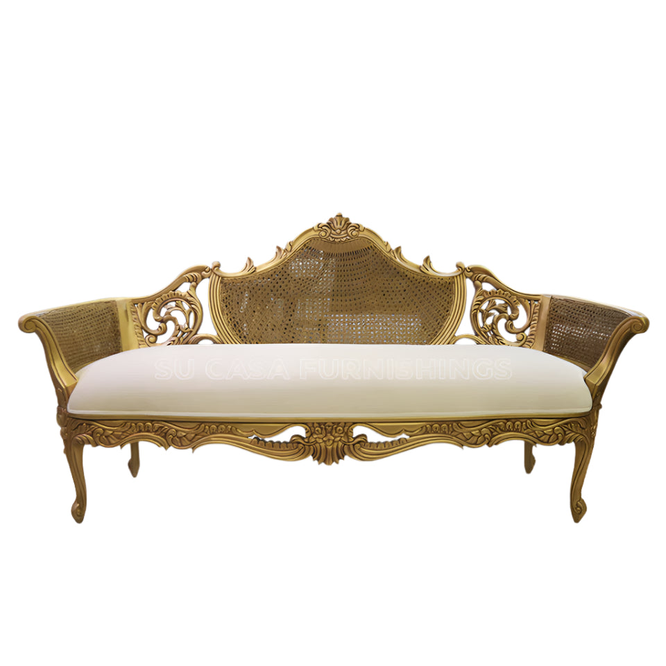 Gold-painted wooden frame with lavishly carved detailing, a high backrest, and curved arms, paired with a plain white upholstered seat for contrast.