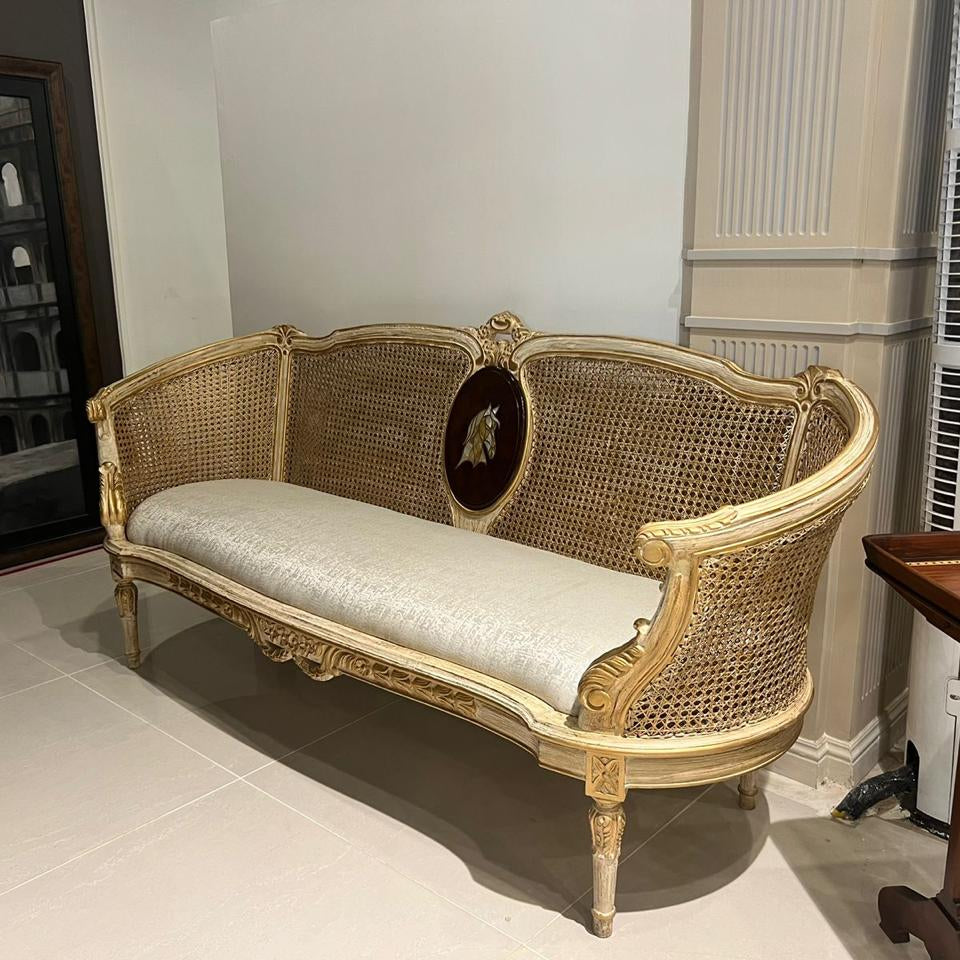 This antique-style sofa boasts an oval medallion backrest with carved details and patterned upholstery. Delicate and artistic in its structure. Perfect for heritage-inspired interiors.