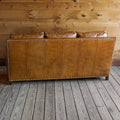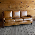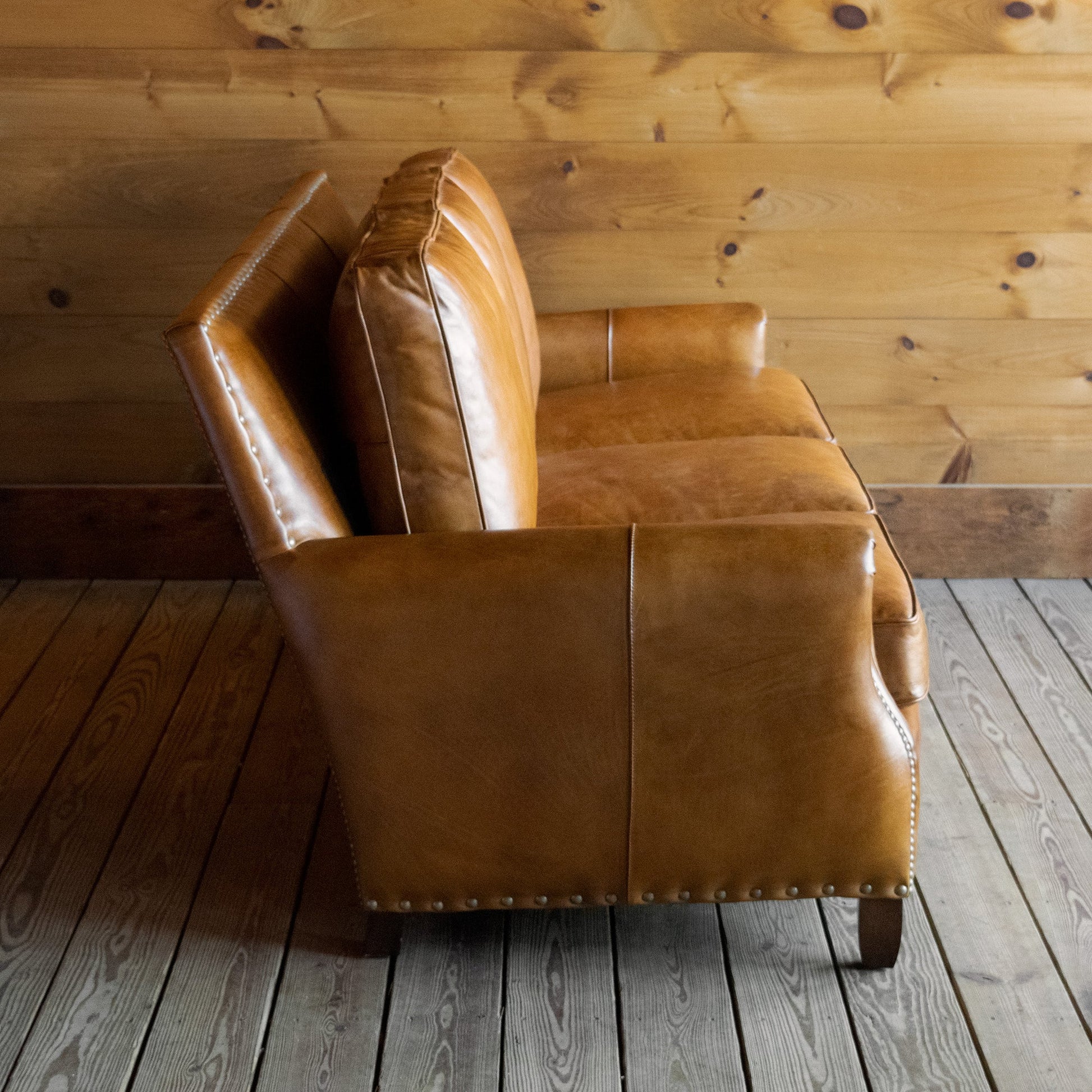Vintage design meets contemporary comfort with plush tan leather and clean lines. Slightly rounded back and arms for extra coziness. Works beautifully in cabin, rustic, or retro-style rooms.
