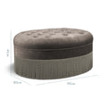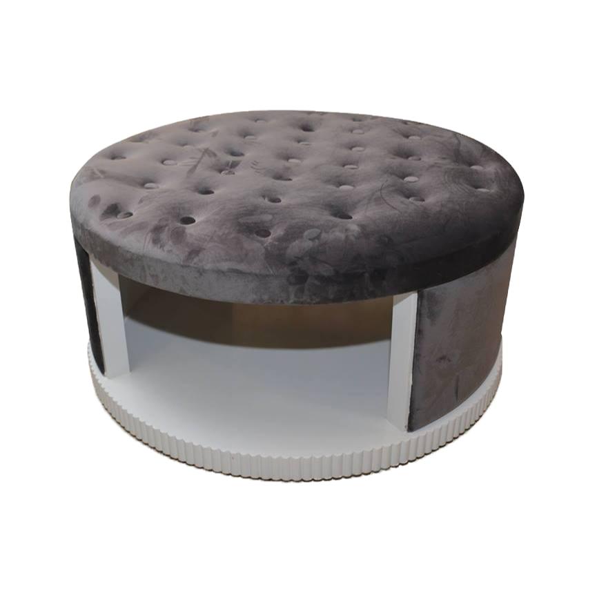 This round ottoman boasts a deep button-tufted charcoal velvet top with a contrasting white and mirrored open base. The sleek design doubles as both seating and modern storage. A bold centerpiece for glam or contemporary interiors.