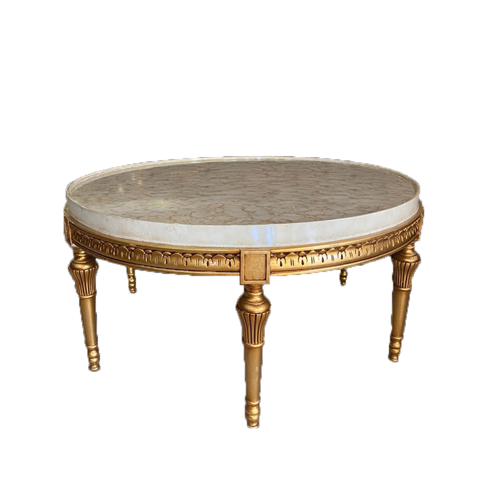 A round table with a white and gold veined marble top, adorned with gold trim and set on straight, fluted legs with ornate gold accents.