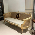 Crafted with cane panels and a rounded back, this sofa merges colonial charm with Parisian luxury. The high curved sides are paired with cream upholstery and carved trim, forming a cozy, enclosed seat ideal for drawing rooms or hallways.