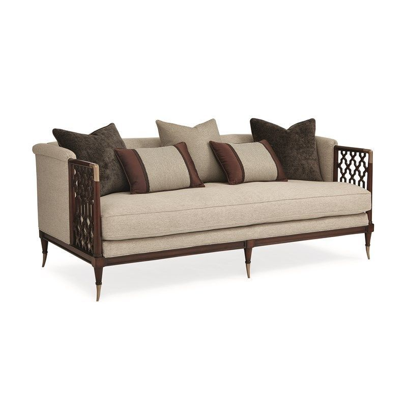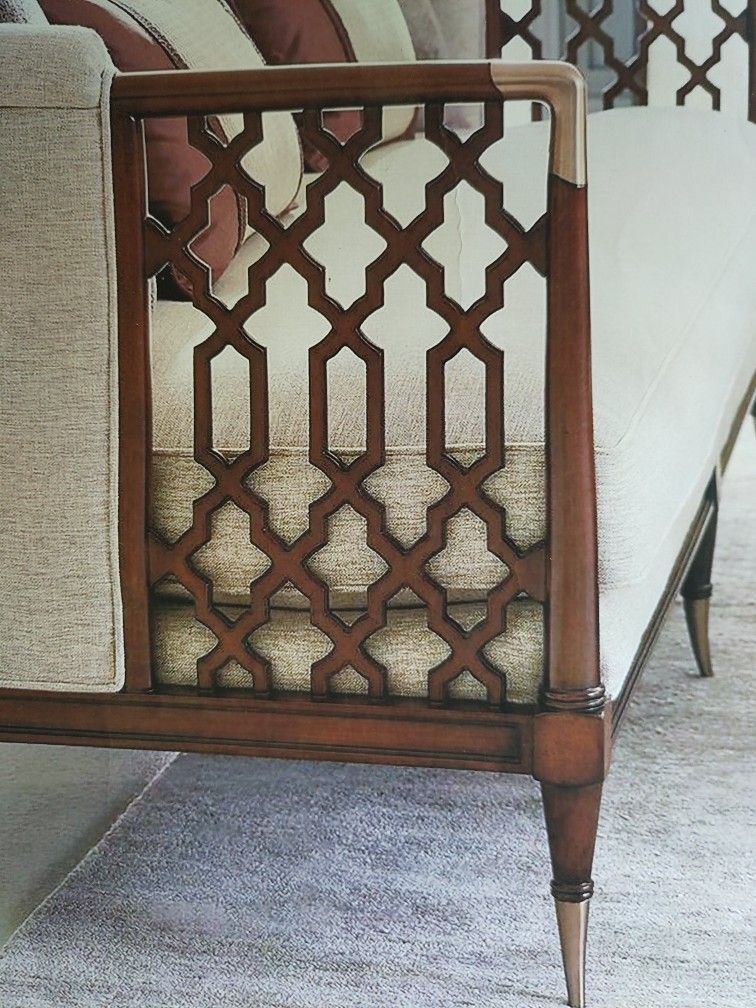 A contemporary interpretation of royal design, this sofa features a minimalist form with open-cut wooden armrests and tailored cushions. Its sleek legs and symmetrical profile contrast with traditional wood carvings for a fresh, transitional appeal. The neutral palette keeps it versatile.