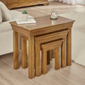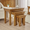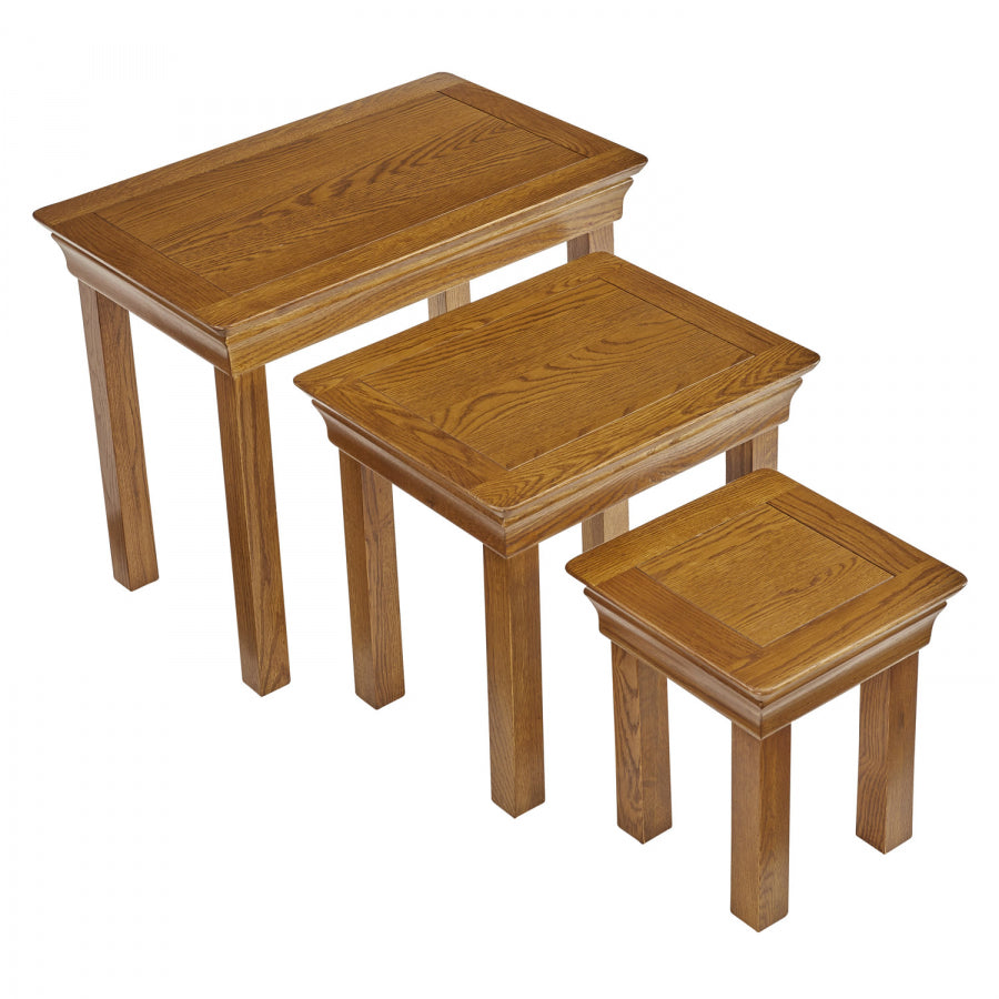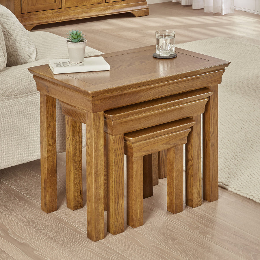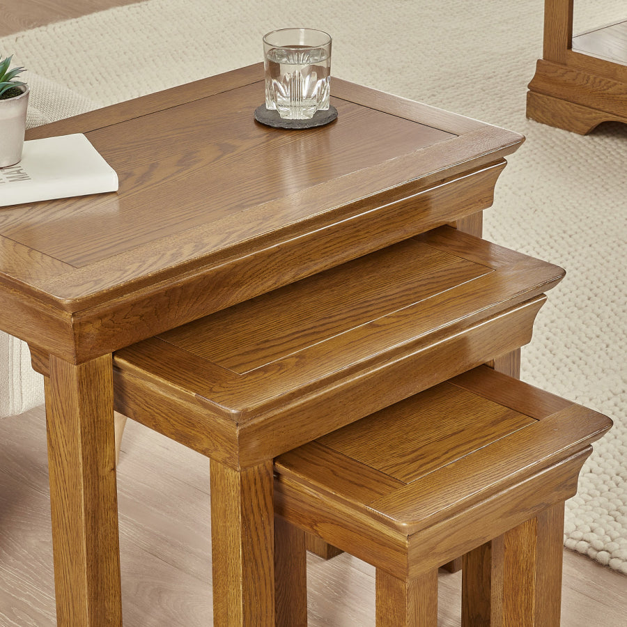 Made from solid oak with a golden oak finish, this set is adorned with subtle carved detailing.