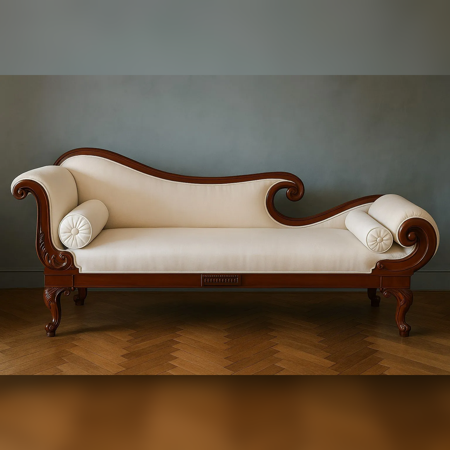 Deep mahogany frame with rolled arms and legs, paired with cream upholstery and cylindrical cushions—ideal for traditional or colonial settings.