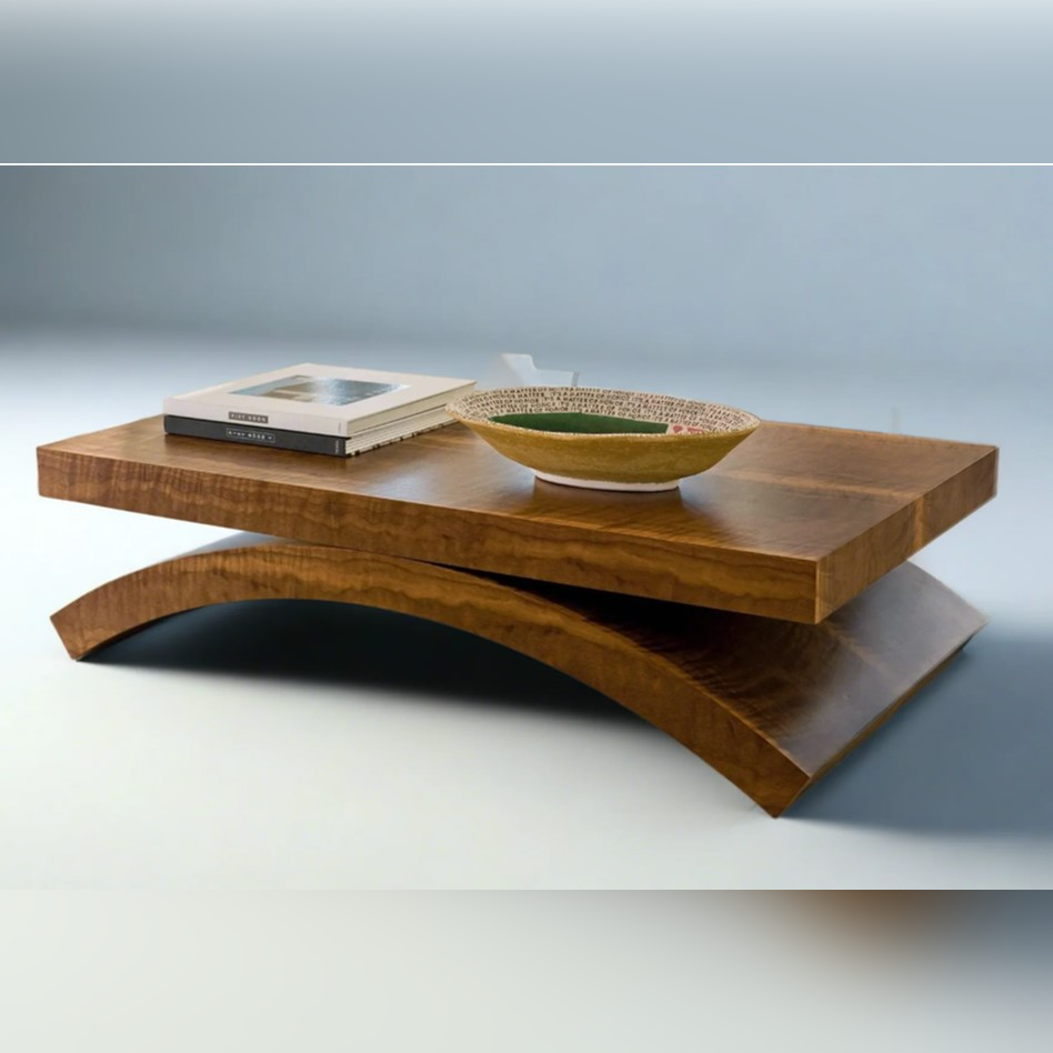 A true statement piece, this center table is crafted from rich, polished wood with two layered rectangular tops curving in opposite directions. The arched base adds architectural elegance and movement to the design, perfect for artistic and contemporary interiors.