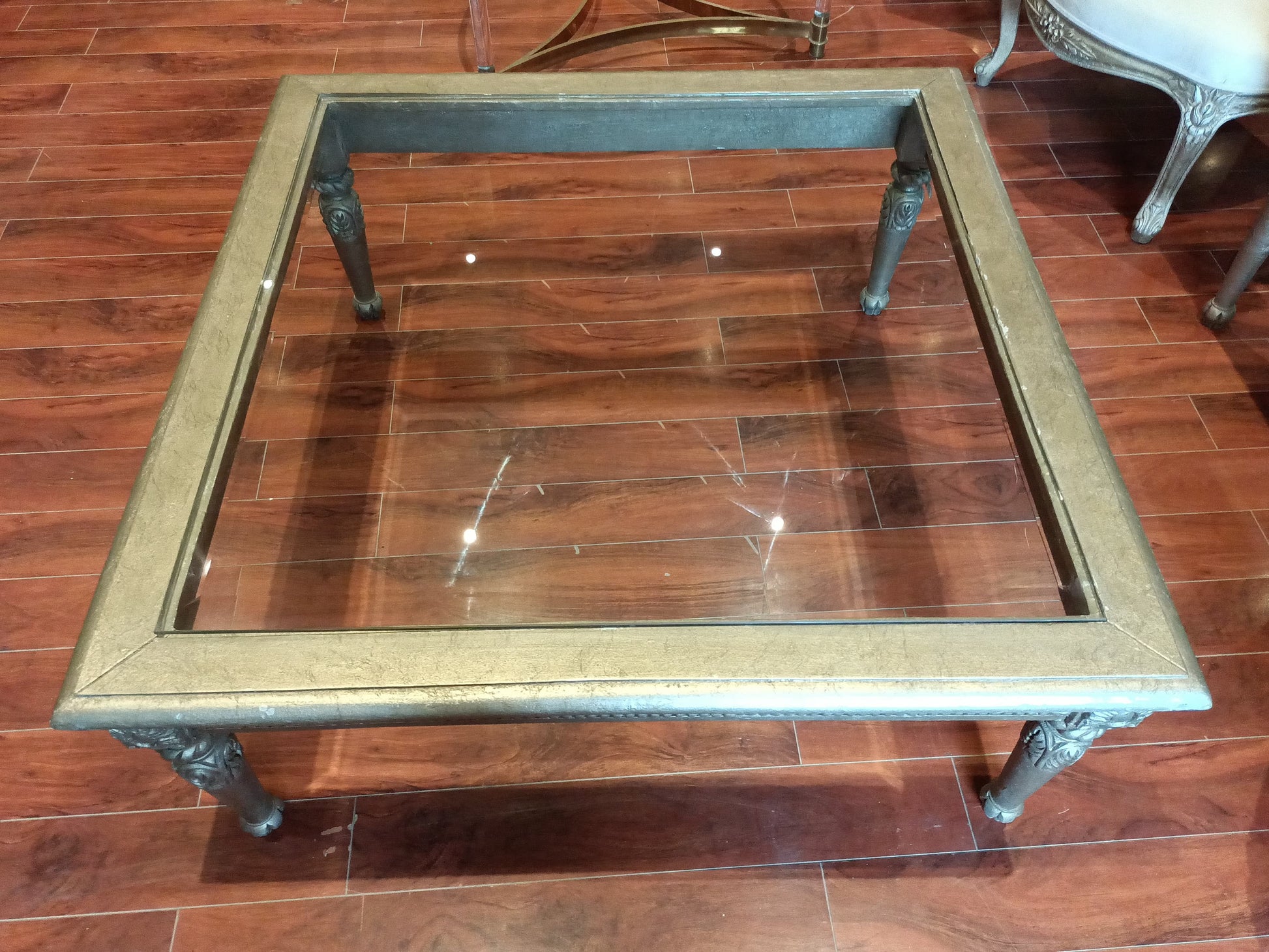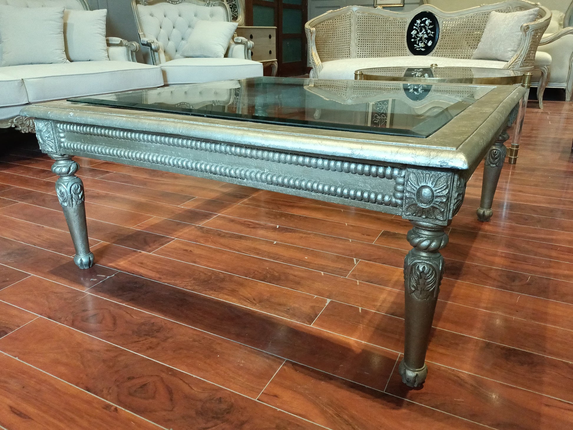 This console features a silver-leaf finish with carved details and glass top. Its slender legs and intricate design offer a touch of glamour. Ideal for hallways or luxurious entryways.