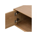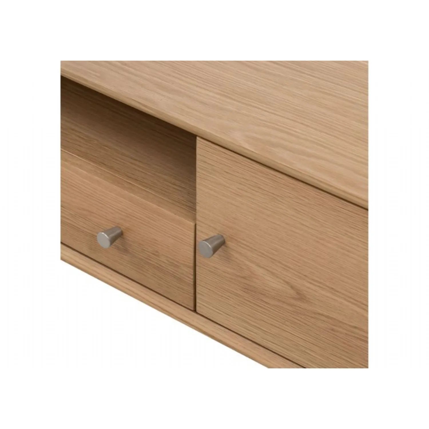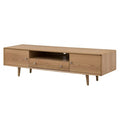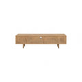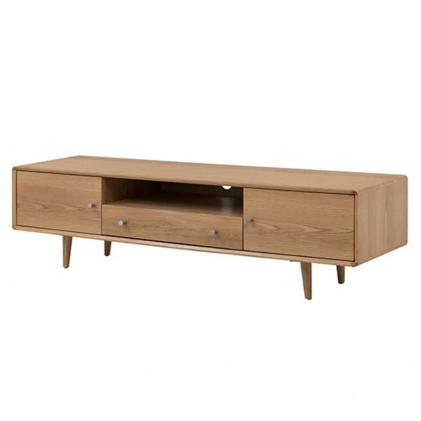 This streamlined unit in blonde natural wood includes tapered legs and smooth surface detailing. It features a clean, open-and-closed storage combination. Best for light-toned, neutral contemporary homes.