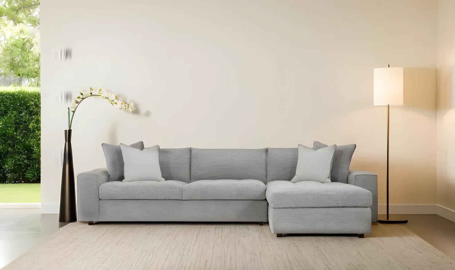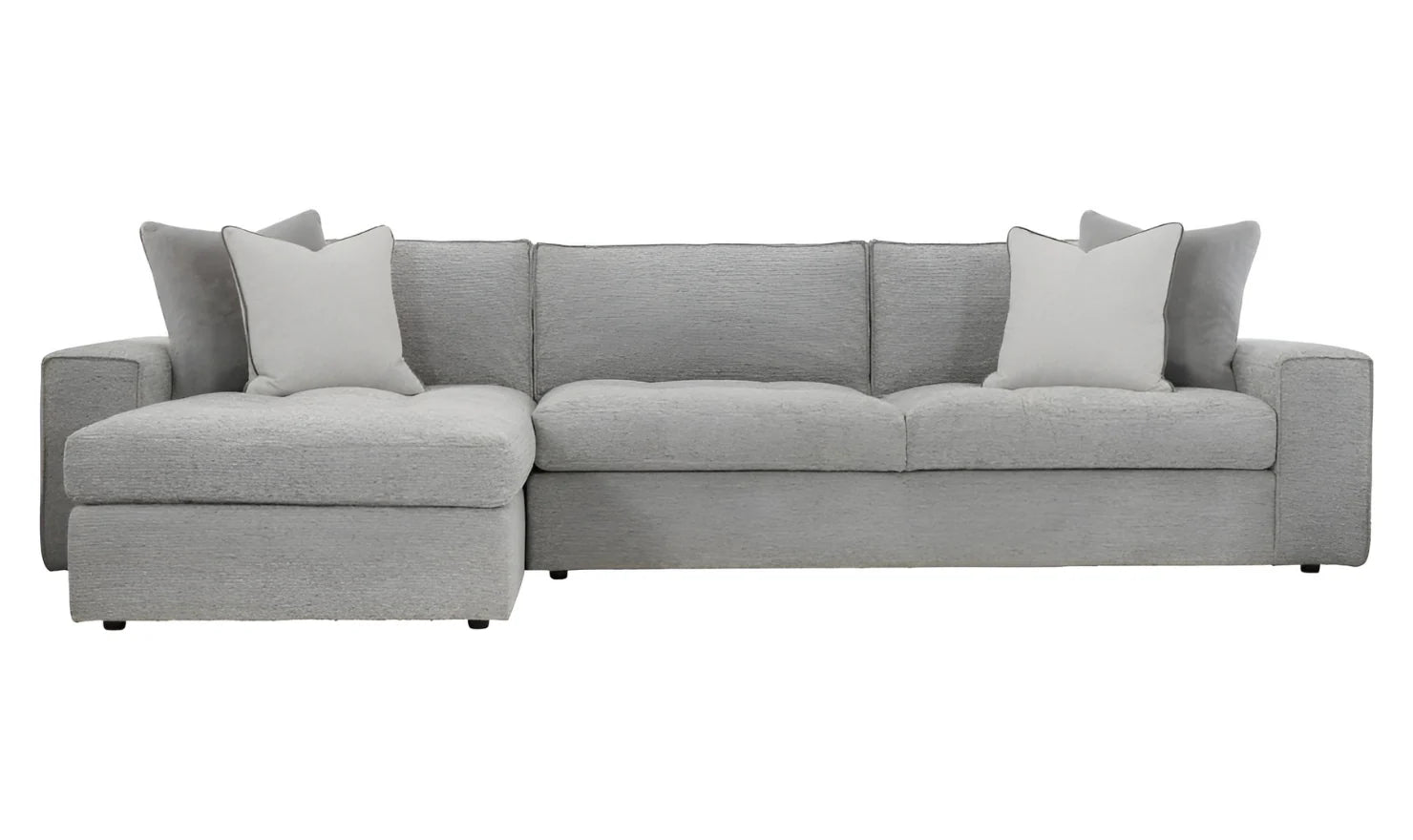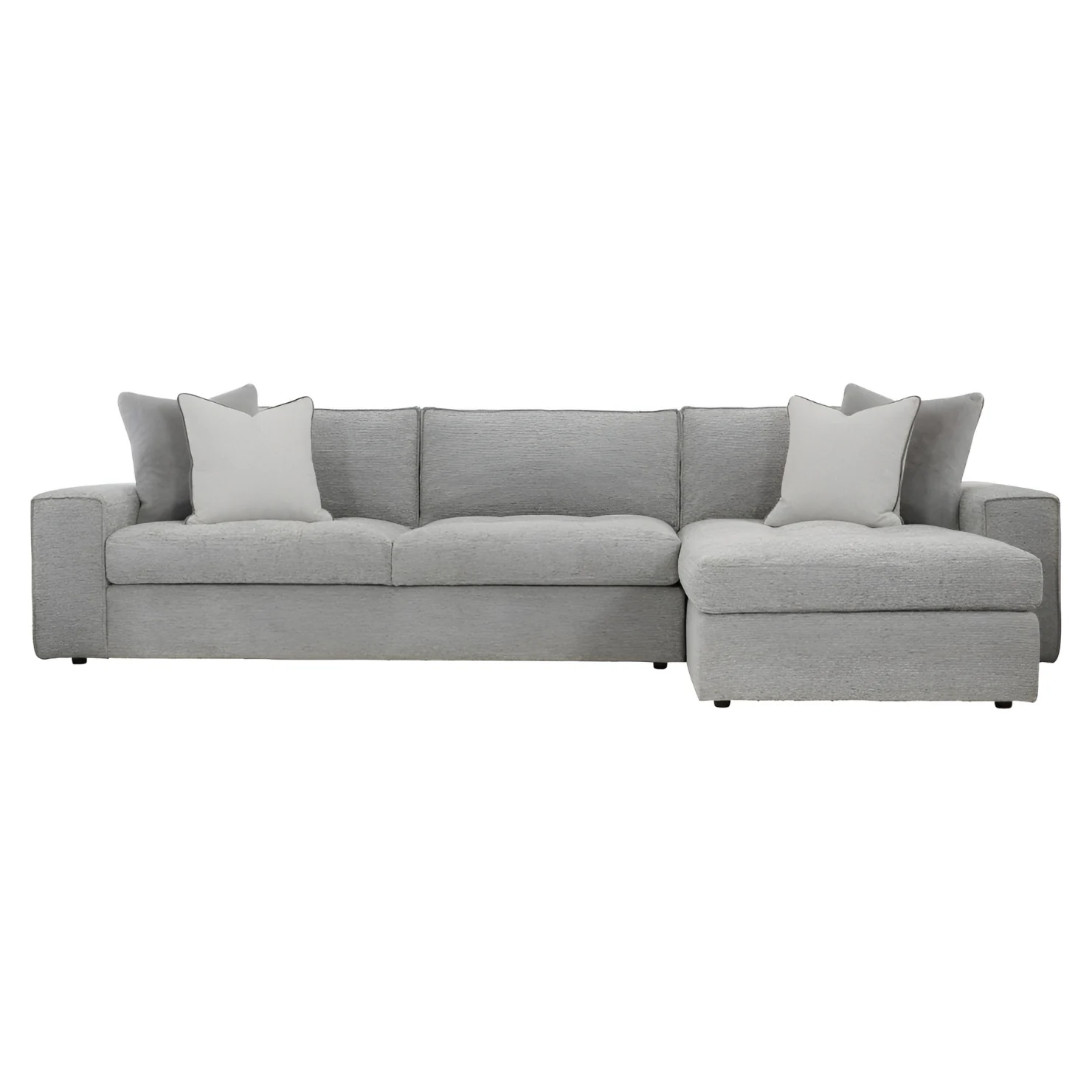 This sectional is covered in a soft heather gray fabric with a wide chaise and structured arms. The design is transitional, blending into both casual and formal living areas. Back and seat cushions are plush but supportive. Neutral tone makes it easy to coordinate.