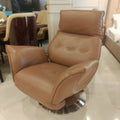 This recliner features smooth tan leather upholstery with plush cushioning and ergonomic armrests. Its manual reclining mechanism offers comfort without compromising aesthetics. The sleek design complements modern interiors with a warm, welcoming vibe.