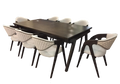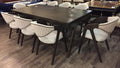 Designed with a sleek dark wood table, this set includes eight chairs featuring quilted backs and plush cushions. The contrast between light upholstery and black frames enhances its modern luxury. Perfect for spacious dining areas with upscale, urban decor.