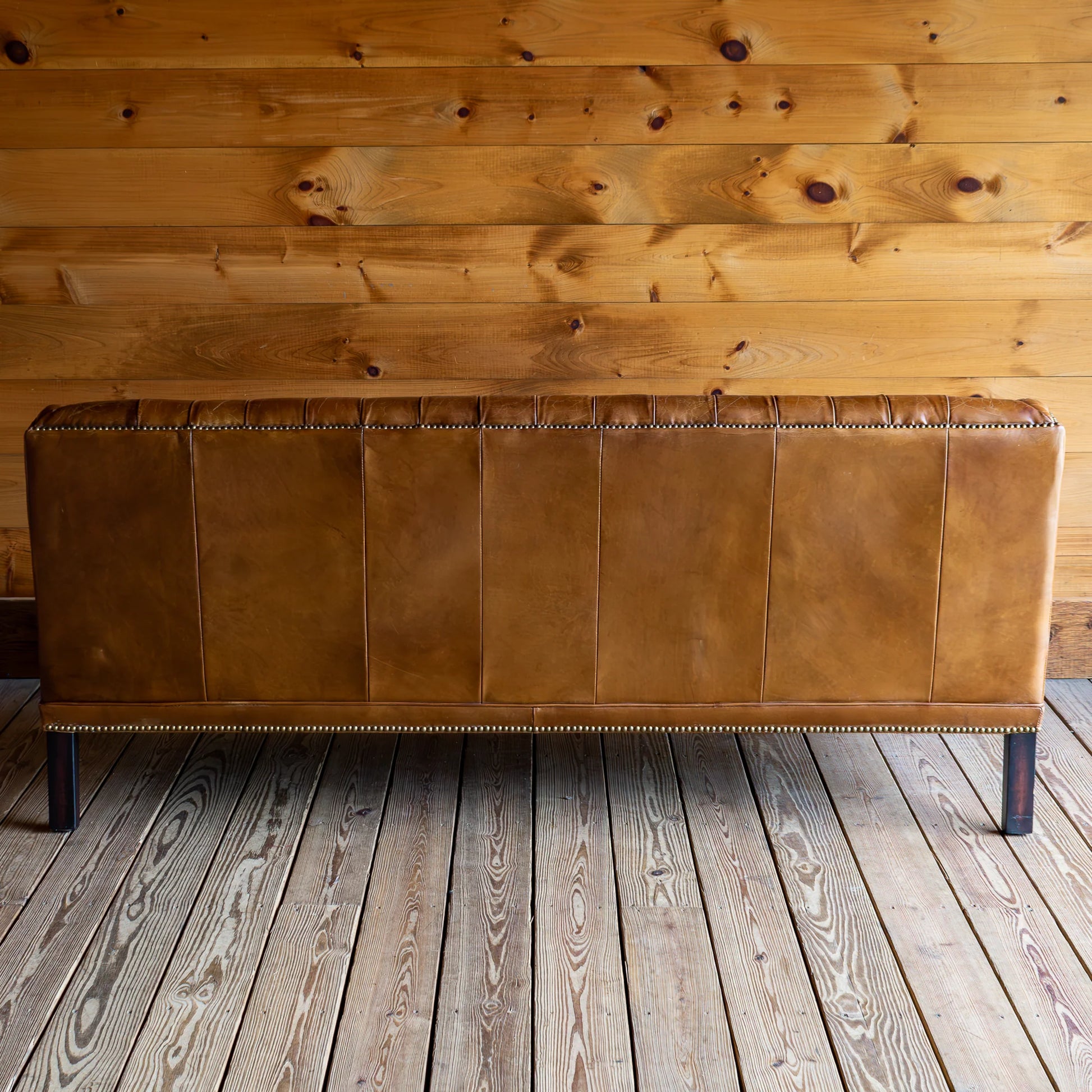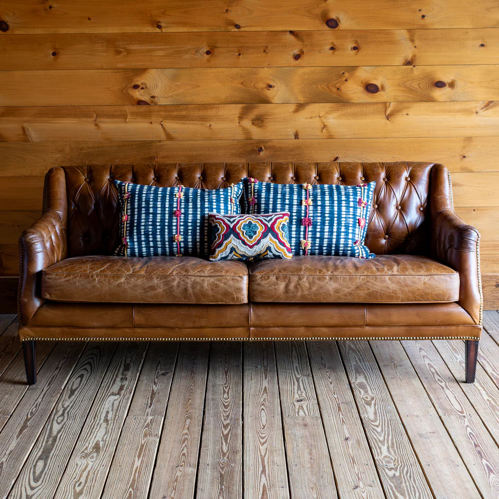This sofa brings tribal-inspired decor alive with vibrant accent pillows and classic brown leather. The carved wood frame adds rustic charm. Ideal for eclectic or boho-style interiors.